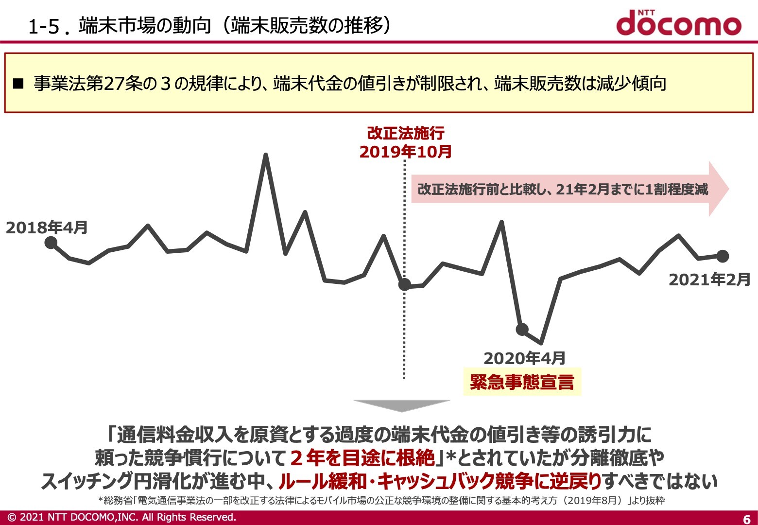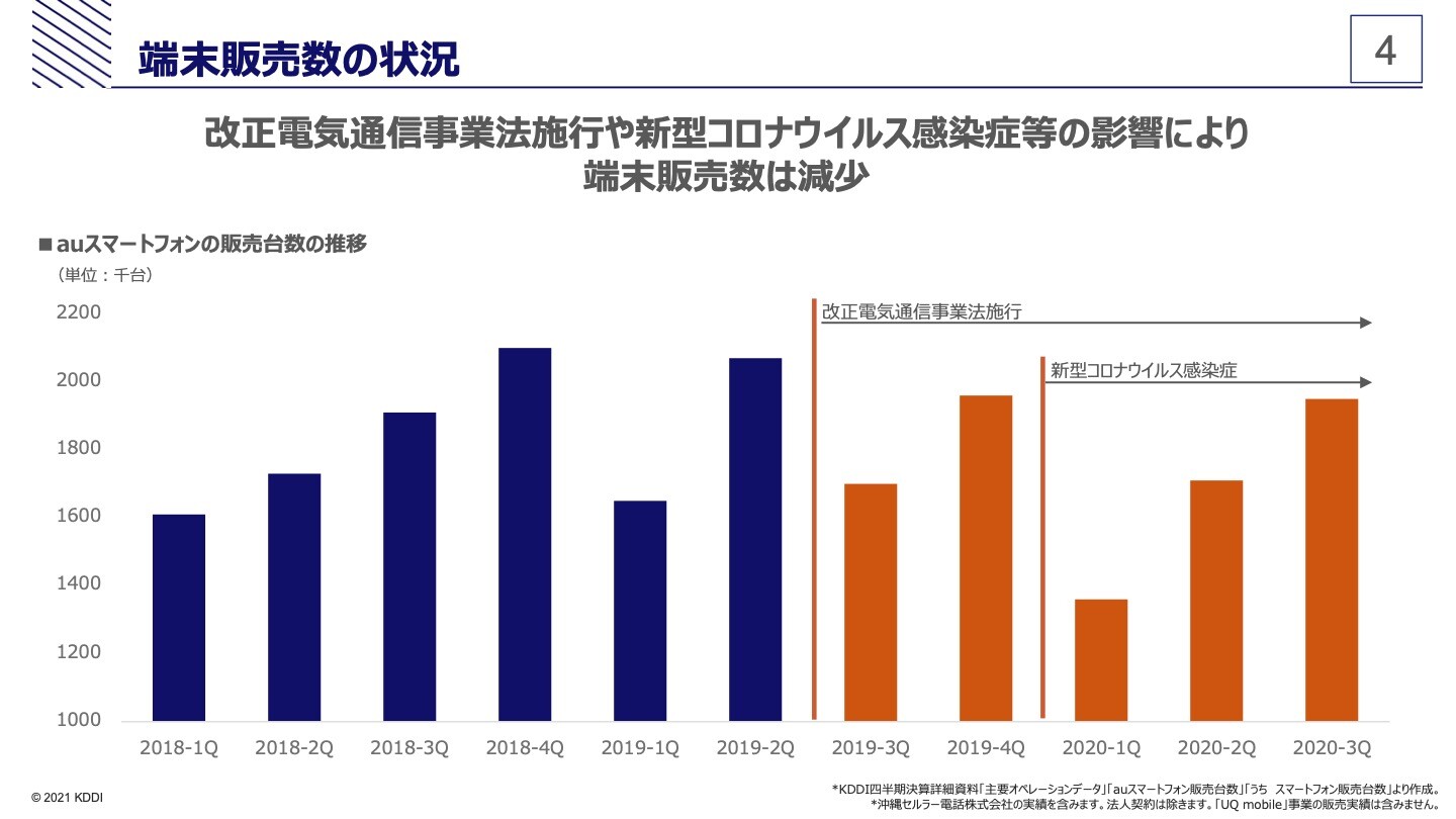 なお、電気通信事業法の改正によってこれらの割引額の上限などが設定されたことによる端末販売台数への影響についてはNTTドコモでは減少傾向だとして改正前と比べて今年2月までに1割程度減り、KDDIでも新型コロナウイルス感染症(COVID-19)の影響も含めて減少しており、ソフトバンクでは改正後に一時的には減少したものの、直近においては特段大きな変化はなく、端末販売数に大きな変化はないとしています。