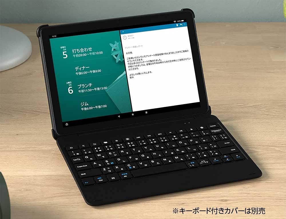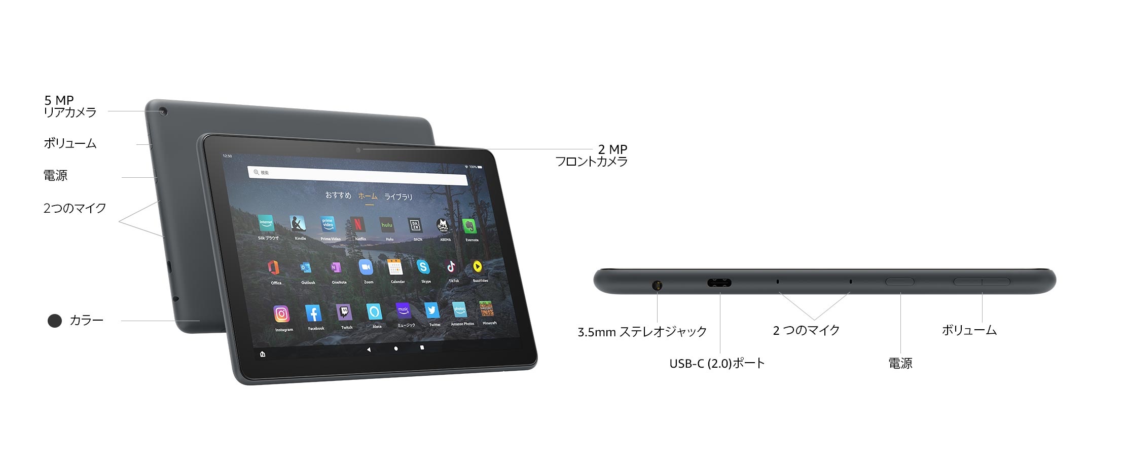 最大12時間の連続動作時間で、充電時間は9W充電アダプタで約4時間。また無線LAN(Wi-Fi)もWi-Fi 5(IEEE802.11ac準拠)やBluetooth 5.0に対応。なお、Wi-Fi 6(IEEE802.11ax準拠)は非対応。3.5mmイヤホンマイク端子やUSB Type-C端子(USB 2.0)、デュアルステレオスピーカー、マイク、Dolby Atmos、Alexa、ハンズフリーモード、加速度センサー、環境光センサーなども搭載しています。