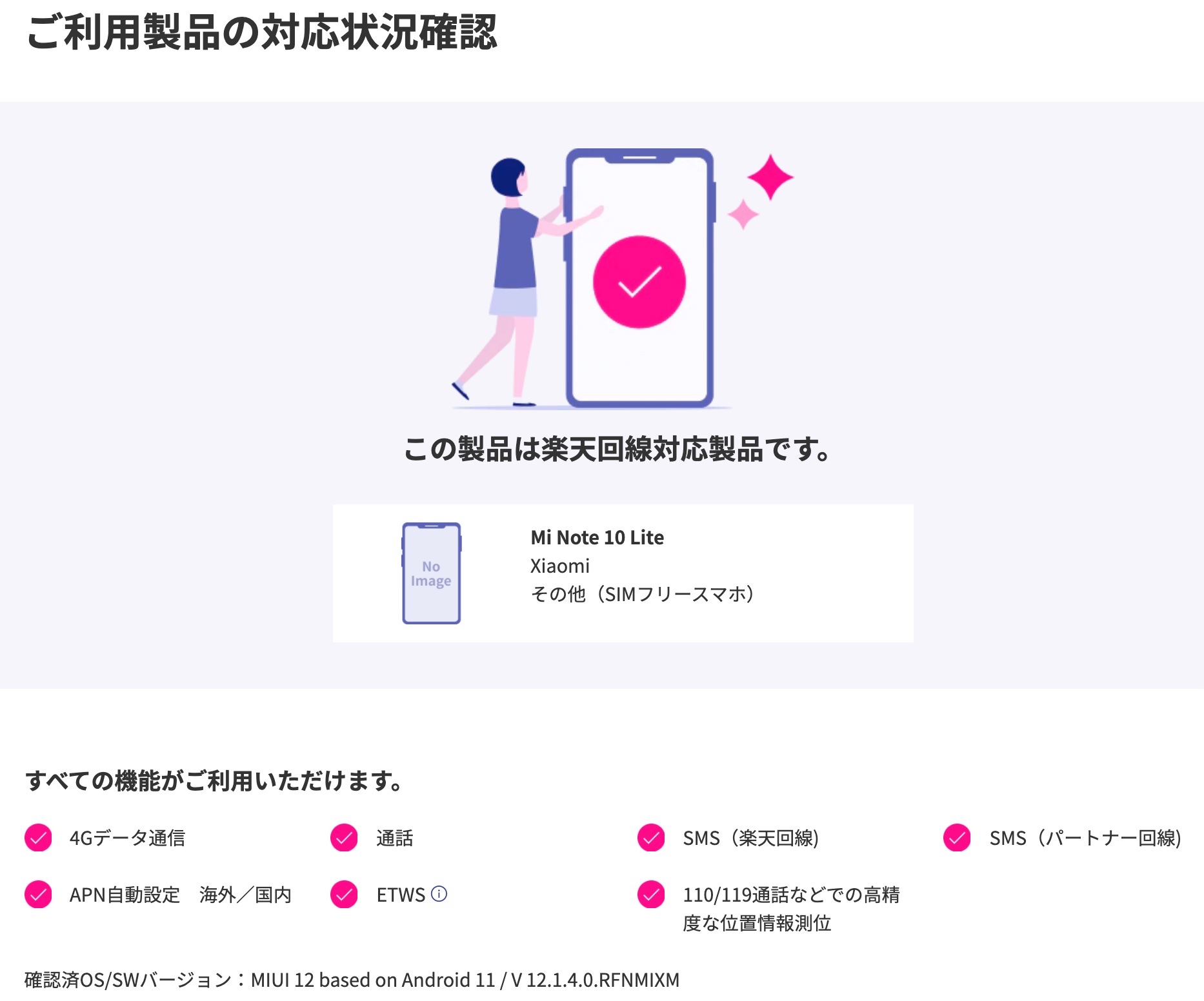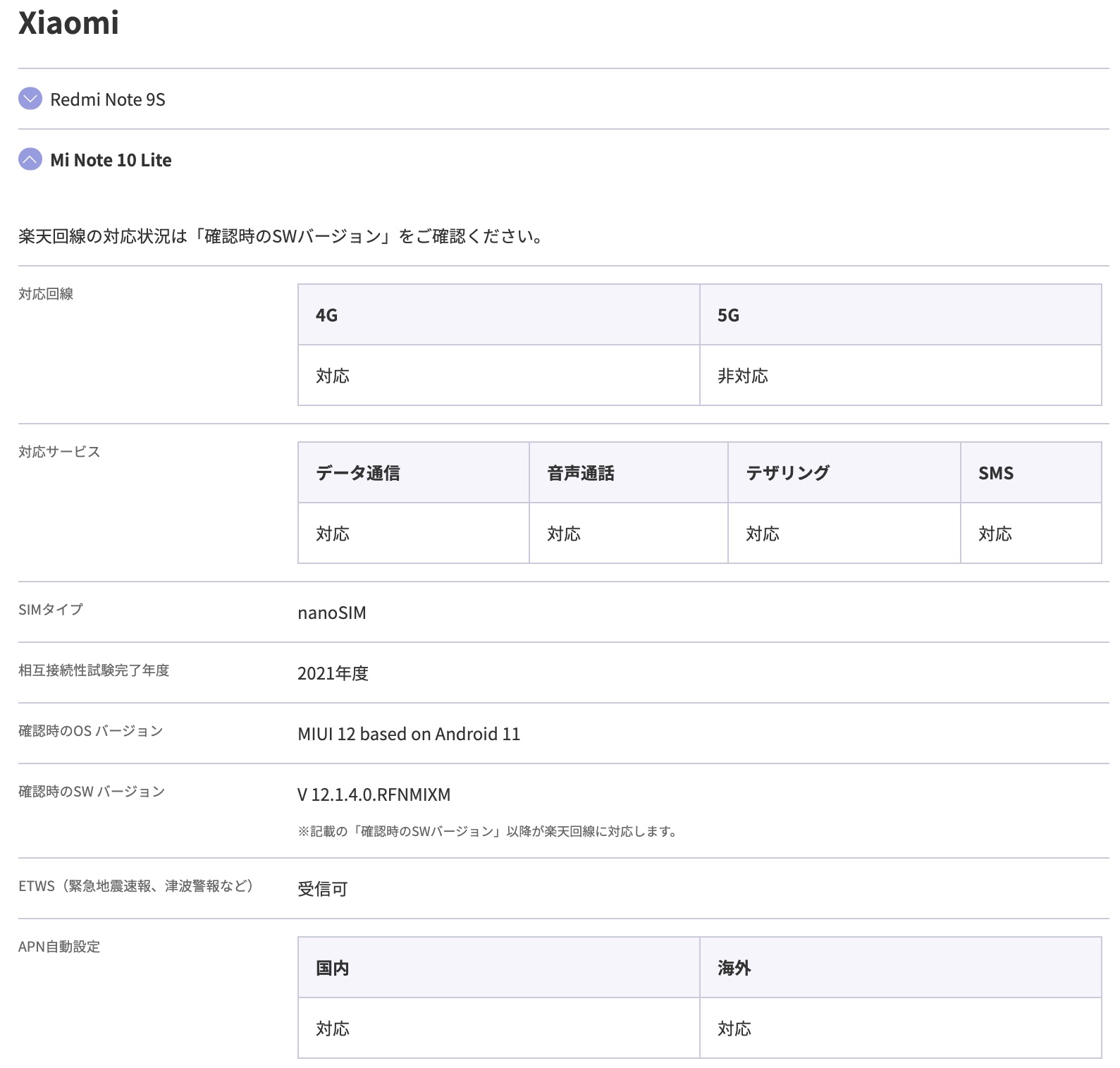 すでにMi Note 10 LiteについてはXiaomiや楽天モバイルから公式に音声通話やSMS、データ通信を使えることが案内されていましたが、一方で緊急速報メール(ETWS)などの一部機能が利用できないとされていました。今回、楽天回線対応製品に追加されたことによってETWSなどのすべての機能が利用できるようになっています。
