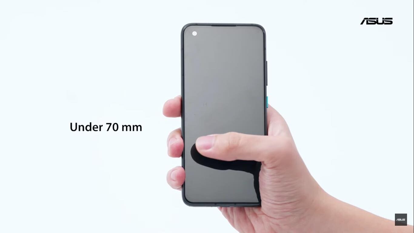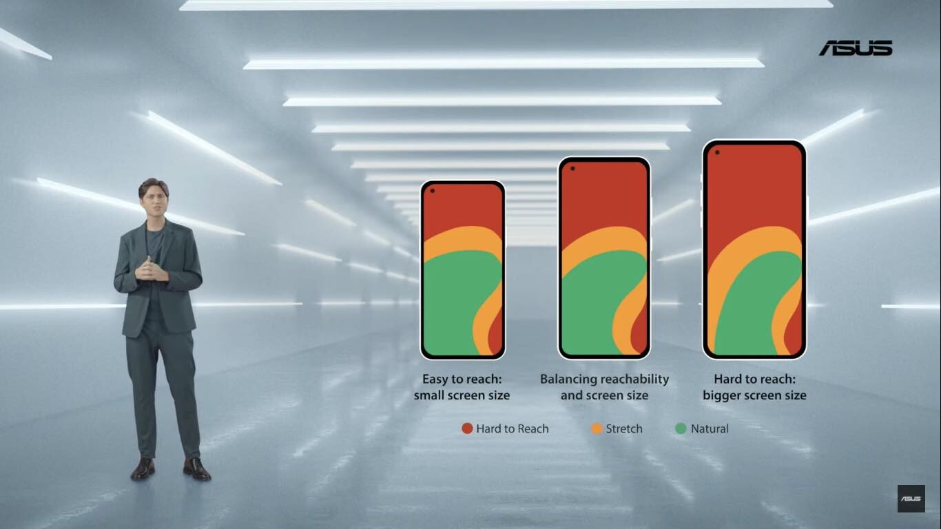 ASUSでは片手で操作しやすい大きさがどのくらいかを検証し、幅は70mm以下であるとした上で、どんどん縦長になっている最近の流行に対して縦は「いくらでも長くてもいいのか?」と疑問を呈しつつ、ポケットに入れたりする場合を考えると70mm弱の幅からすると5.9インチサイズが完璧な大きさだと結論付けました。