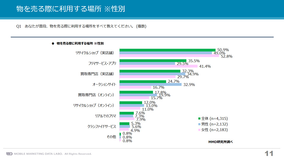 利用比率に男女差が若干見られるのが面白い点で、リサイクルショップや買取専門店ではあまり大きな差がないものの、フリマサービス・アプリでは女性の利用が10%以上多く、オークションサイトの利用は男性が15%以上も多くなっています。