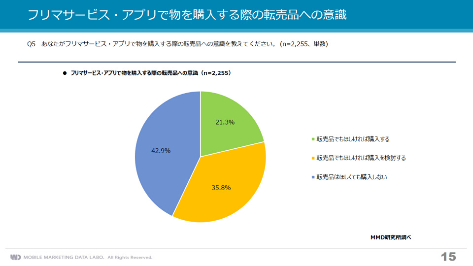 「フリマサービス・アプリで物を購入する際の転売品への意識」という調査項目では、実に21.3%もの人が「転売品でもほしければ購入する」と答えており、さらに35.8%の人は「転売品でもほしければ購入を検討する」と答えています。