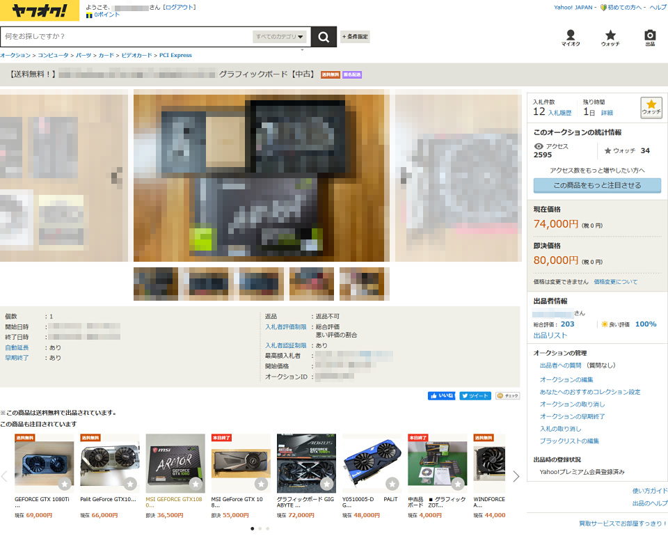 特に筆者が処分しようとした古いPCはゲーミングPCであったため、かなり性能の良いグラフィックボード(グラボ)を搭載していました。そこで「グラボくらいは中古品として売れるのでは?」と考え、オンラインオークションサービス「ヤフオク!」で価格を調べてみたところ、同型・同クラスの製品は7~8万円とかなりの高値で取引されている様子。これは売るしかないとすぐに出品したところ、さっそく7万円以上の価格が付きました。