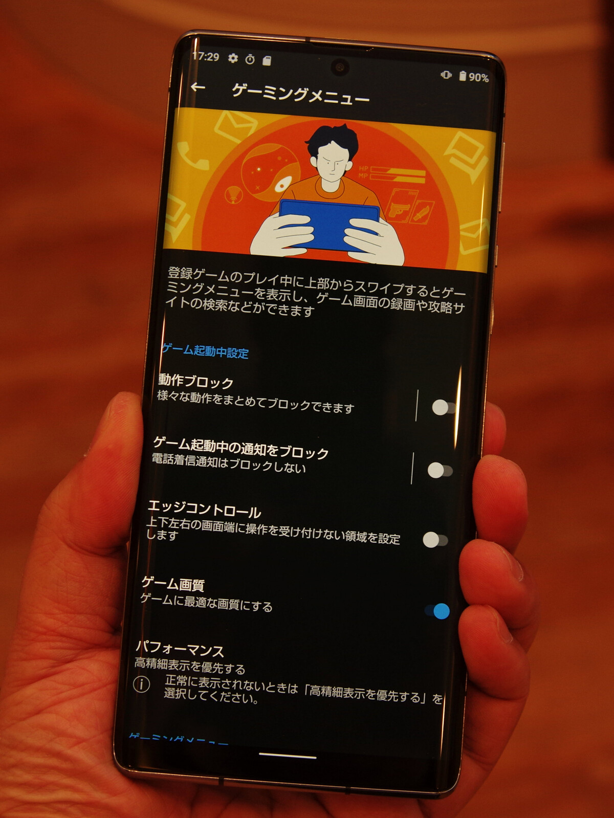 もう1つの特徴となるのが高解像度かつ高輝度ながらも省電力性能も備えたディスプレイだ。最大240Hz駆動の約6.6インチWUXGA+(1260×2730ドット)OLEDパネルはシャープがIGZO液晶で長年培ってきた省電力性能と高性能なOLEDを組み合わせた「Pro IGZO OLED」となった。ピーク輝度2000nitは現行のスマホ向けディスプレイにおいて最大となる。これにより、10億色の色彩階調に加えて2000万:1のコントラスト比を実現。HDR映像をより広い色彩と輝度で表現できるほか、日中屋外での画面の見やすさにも貢献する。