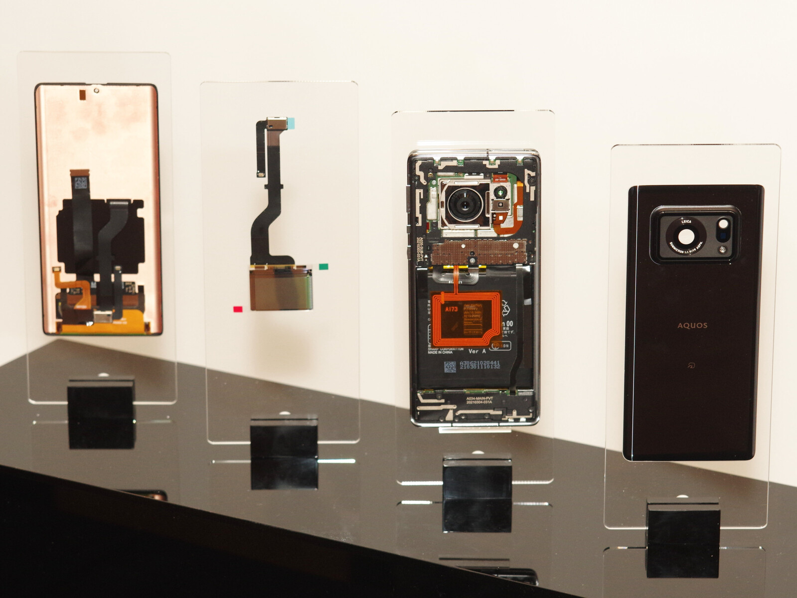 しかしながら、シャープには自社開発のOLEDパネルやAQUOS zeroシリーズなど薄型軽量モデルの開発技術があり、これにライカとの共同開発が加わったことで搭載を実現した。実際にAQUOS R6の分解展示を見ても、本体内で確保できるスペースの多くはこのカメラ部分に費やされているのがわかる。