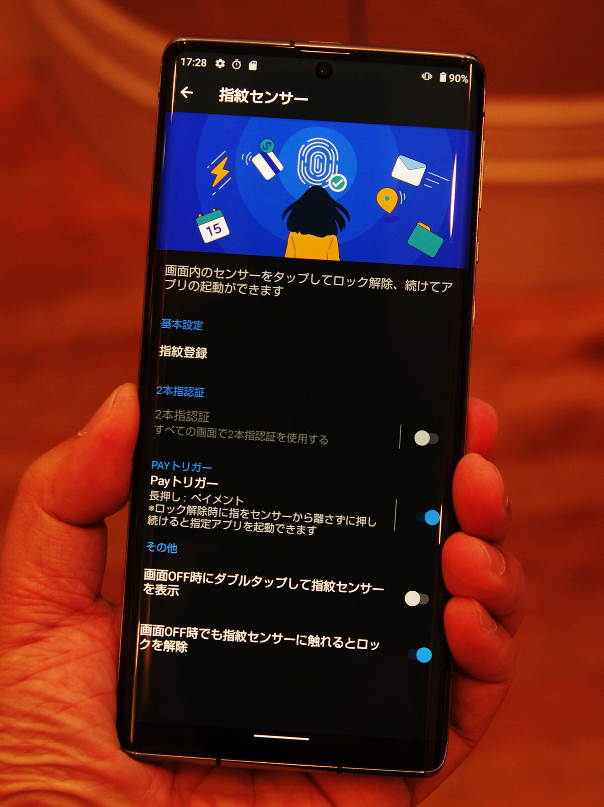また広い指紋認証エリアを活用して指2本を使ったロック解除にも対応し、1本と比べ20倍の安全性があるという。さらに指の長押しで電子決済アプリなど、指定したアプリの起動も可能だ。生体認証は顔認証にも対応しており、画面上部中央にあるパンチホール部分に約1260万画素CMOS/広角レンズ(F2.3)のフロントカメラが搭載されている。