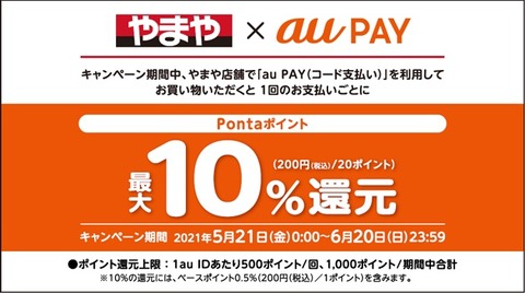KDDIは19日、やまやが展開する酒類や食品などを販売する小売チェーン「やまや」において同社が提供しているスマートフォン(スマホ)など向け決済サービス「au PAY」(コード支払い)で支払うと誰でもPontaポイントを10%還元する『「やまや」で10%還元キャンペーン』を実施すると発表しています。