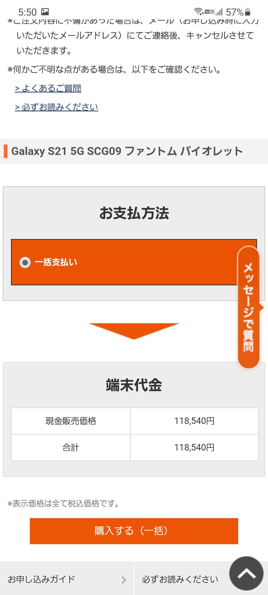 購入は名前やメールアドレス、配送先住所、支払方法などを入力していき、支払方法は一括払いの場合には「クレジットカード」または「代金引き換え」、分割払いの場合には「クレジットカード」のみとなっており、配送先は通常の回線契約ありのときに選べるauショップやau Styleの店頭は選べないとのこと。また一括払いでは購入時にSIMロック解除を選べるようになっています。