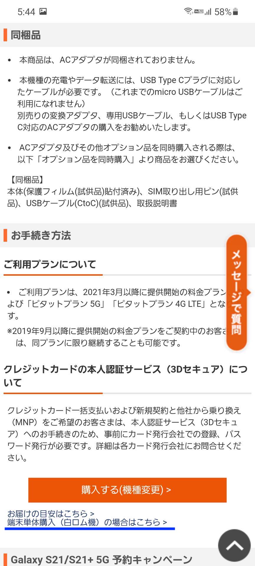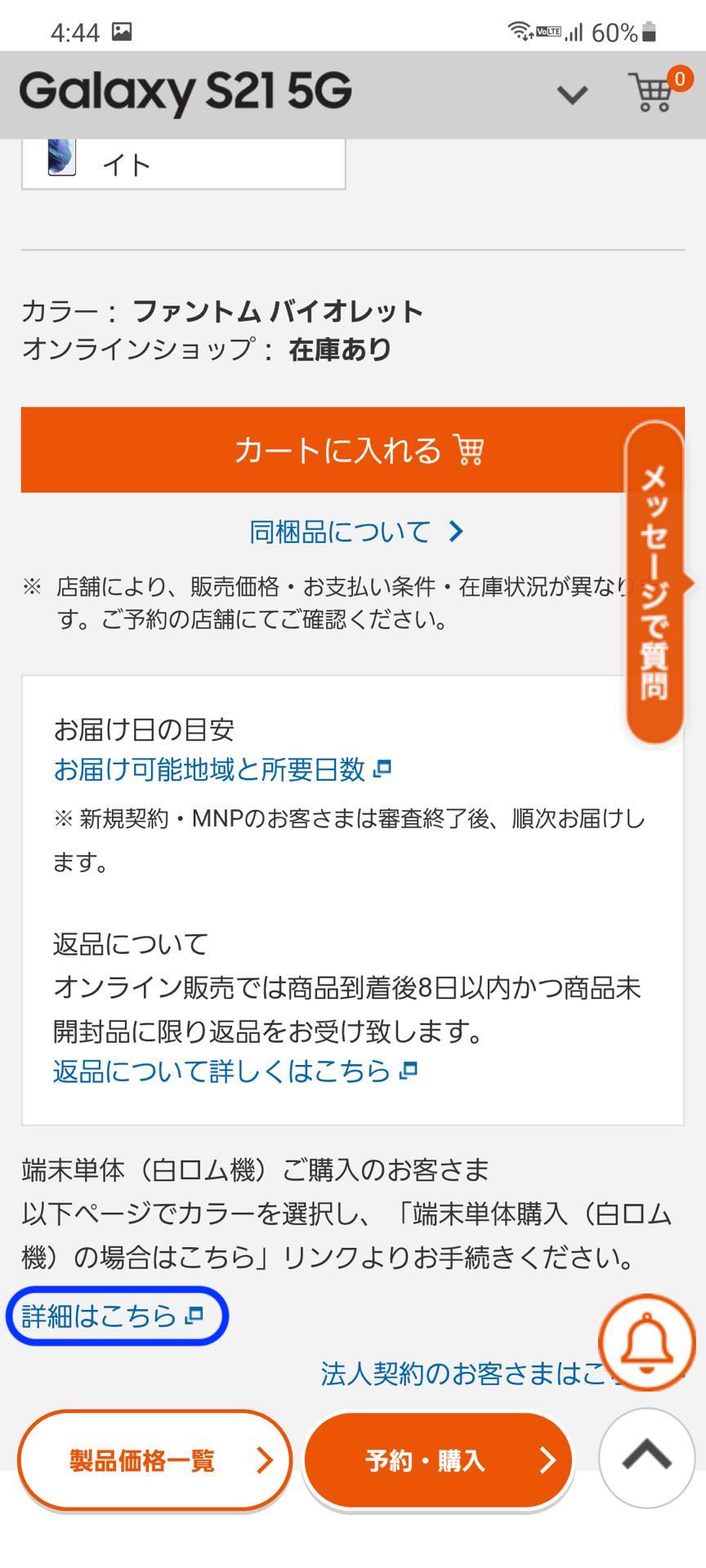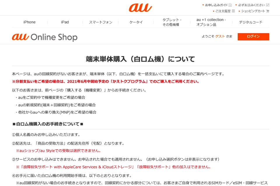 au Online Shopにおける回線契約なしによる製品単体購入はパソコン向けページなら各製品の販売ページを表示して色を選んで下の方にある「端末単体購入(白ロム機)の場合はこちら」から、スマホ向けページならまず購入したい製品を選んで「端末単体(白ロム機)ご購入のお客さま」のところにある「詳細はこちら」を表示して同じく「端末単体購入(白ロム機)の場合はこちら」から行います。