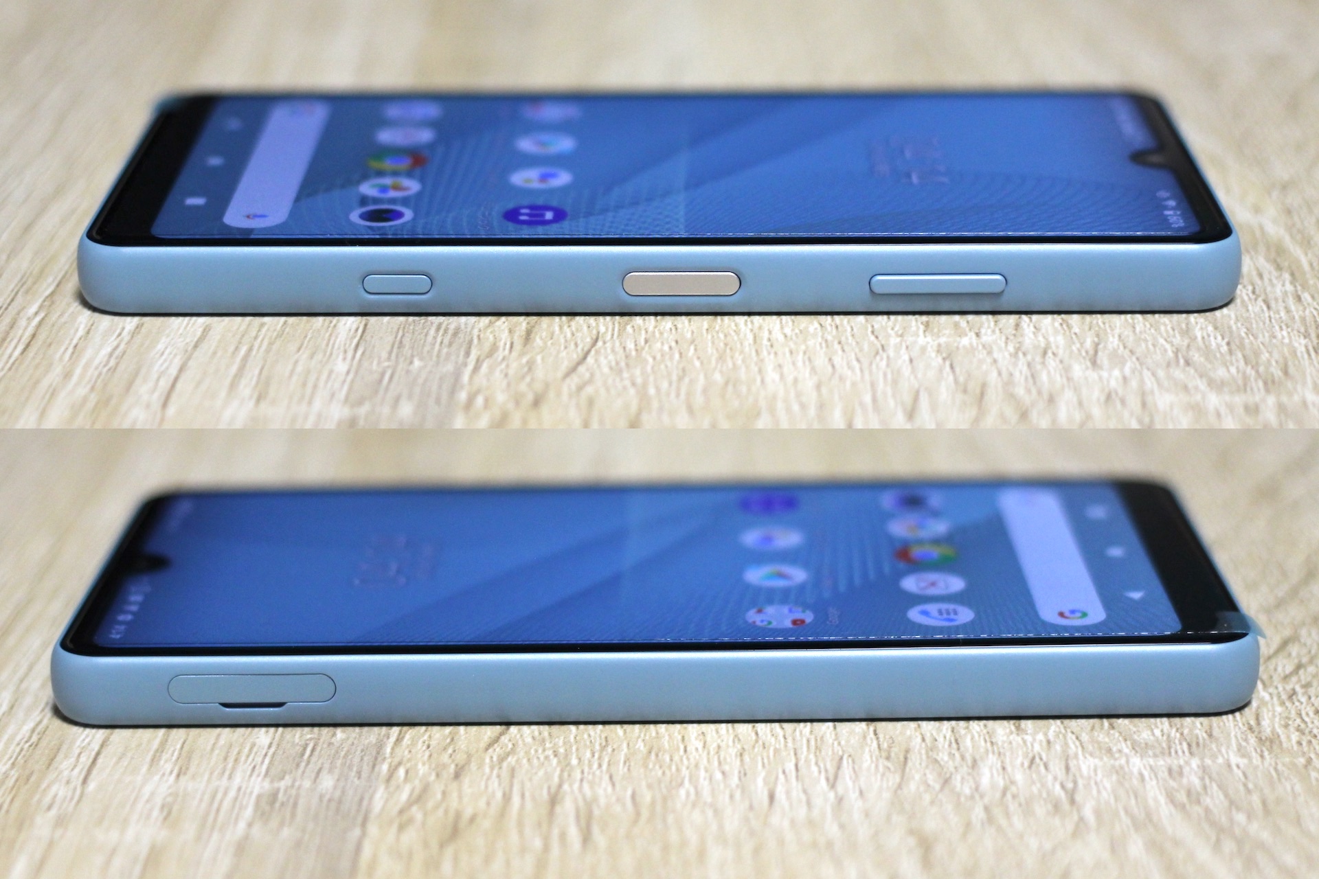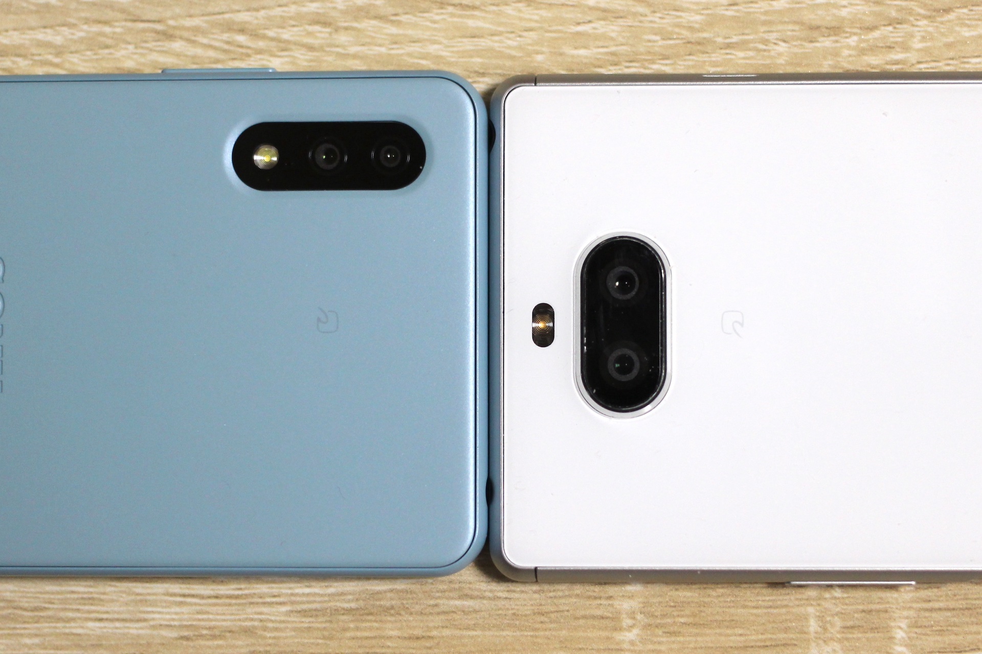 こちらはXperia Ace II SO-41B(左)とXperia 8 SOV42を背面にして横幅を比べたところ。幅はほぼ同じといった印象で、持ちやすさとしてはあまり違いはありませんが、当然ながらXperia 10 IIIやXperia 8などは縦に長いので画面の上の方は指が届きにくいため、片手ですべて操作しようという場合にはXperia Ace IIの方が有利です