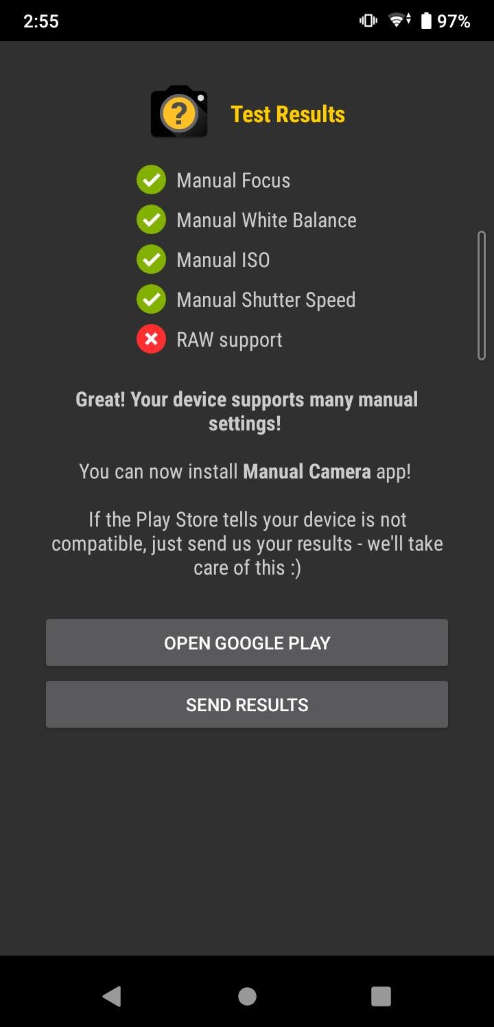 左は標準カメラアプリの設定画面。右はAndroid Camera API v2に対応しているかどうかなどを確認するアプリ「Manual Camera Compatiblity」の結果。Android Camera API v2に非対応のため、サードパーティー製カメラアプリでRAW撮影には対応しません