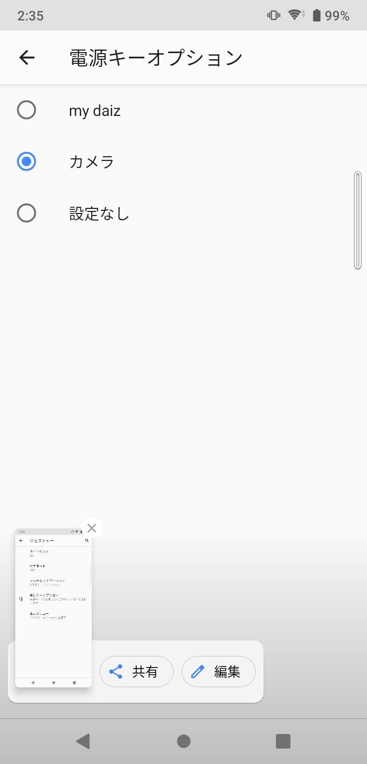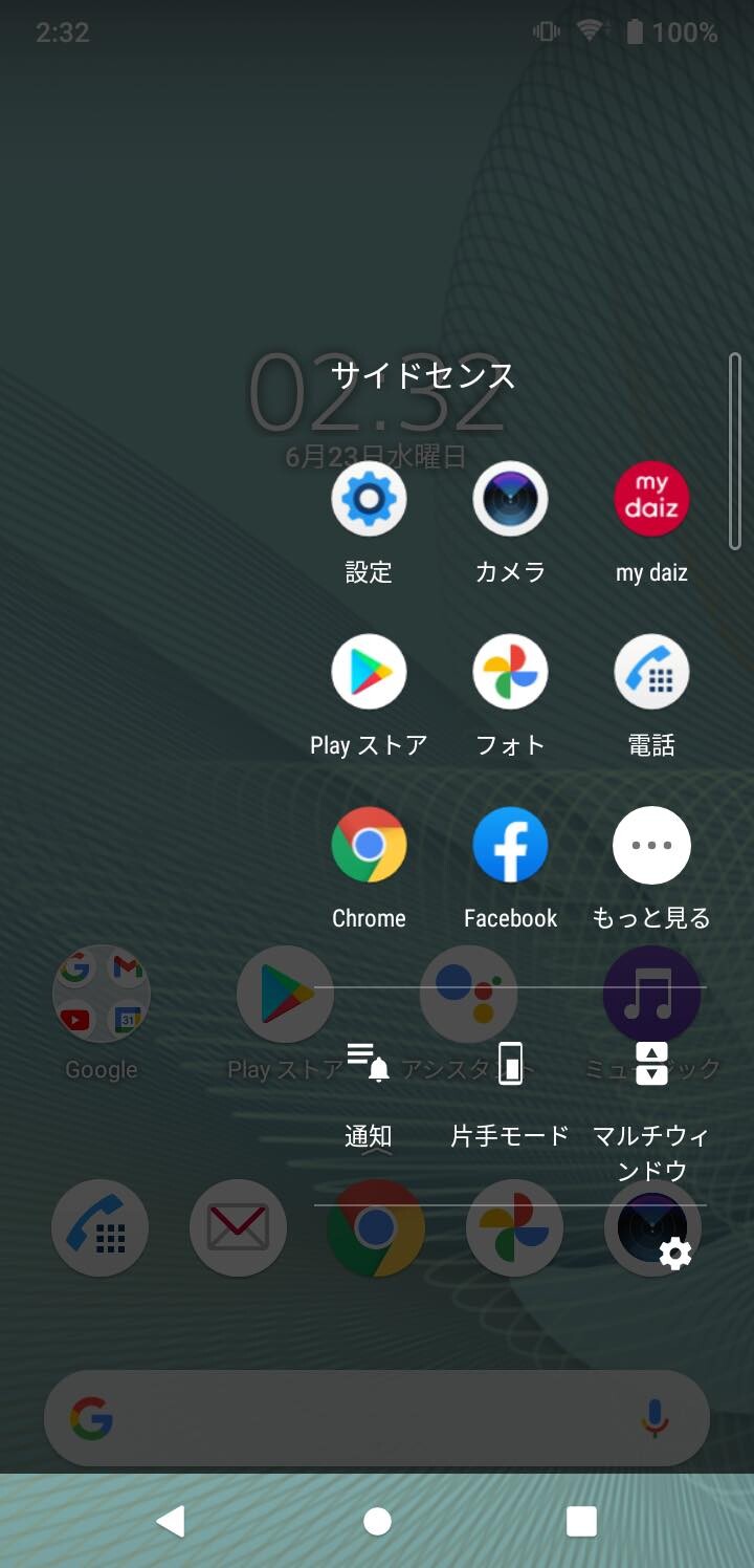 設定の「システム」→「ジェスチャー」にて「サイドセンス」などの設定が行えます。また電源キーの2回押しは初期状態では「my daiz」となっていますが、カメラ起動に変更可能。なお、Googleアシスタントキーは「Googleアシスタント」の起動のみに対応し、他のアプリに変更できず、さらに2回押しや長押しにも対応していないのは残念なところ