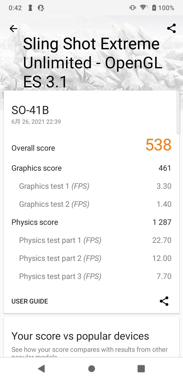 ベンチマークアプリ「Geekbench 5」のCPUと「3DMark」のSling Shot Extreme Unlimited(OpenGL ES 3.1)の結果。それぞれ3回測定した中の中央値で、前者がシングルコアで157、マルチコアで963、後者が538