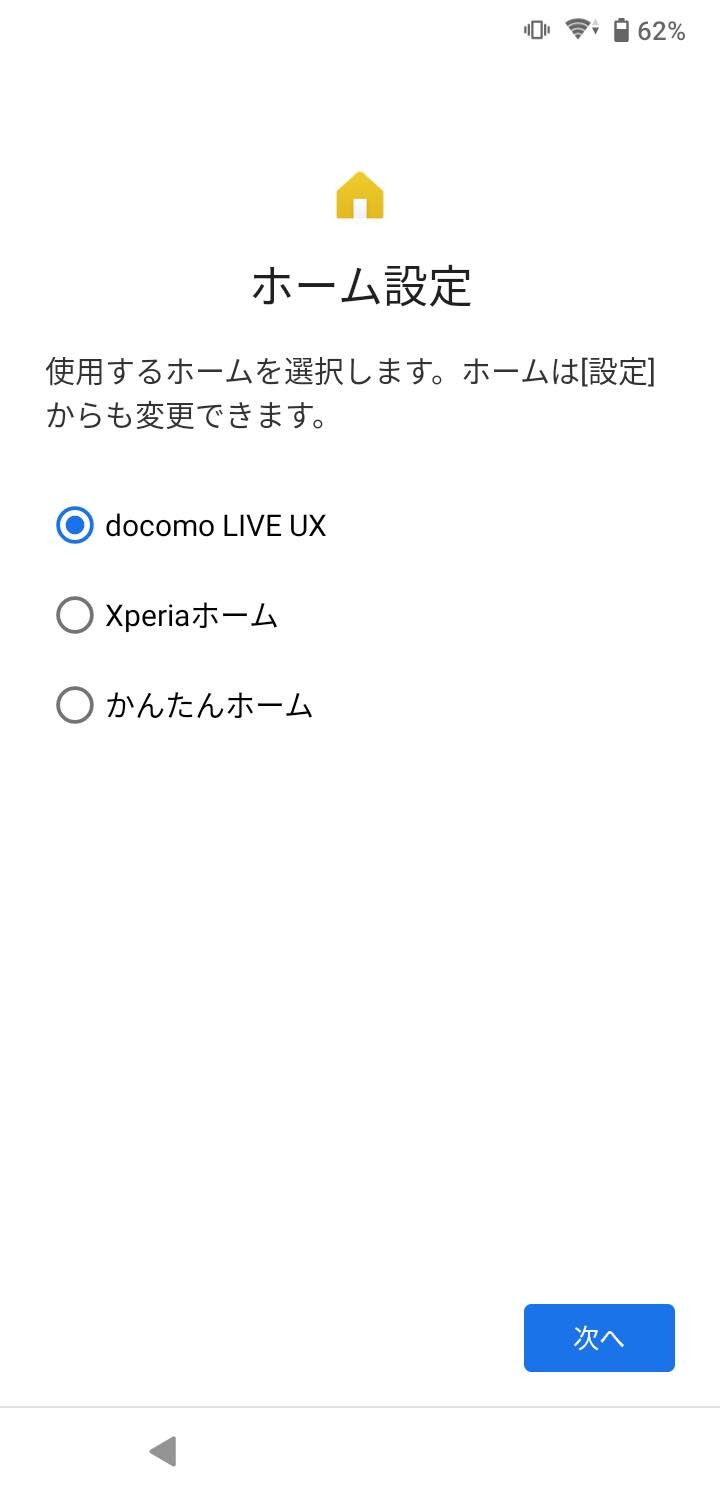 初期設定時にホームアプリを選択することが可能。プリインストールされているのはNTTドコモの「docomo LIVE UX」とソニーの「Xperiaホーム」、「かんたんホーム」。また内蔵ストレージは初期設定直後で17.52GB利用されており、残り45GB以上利用できます