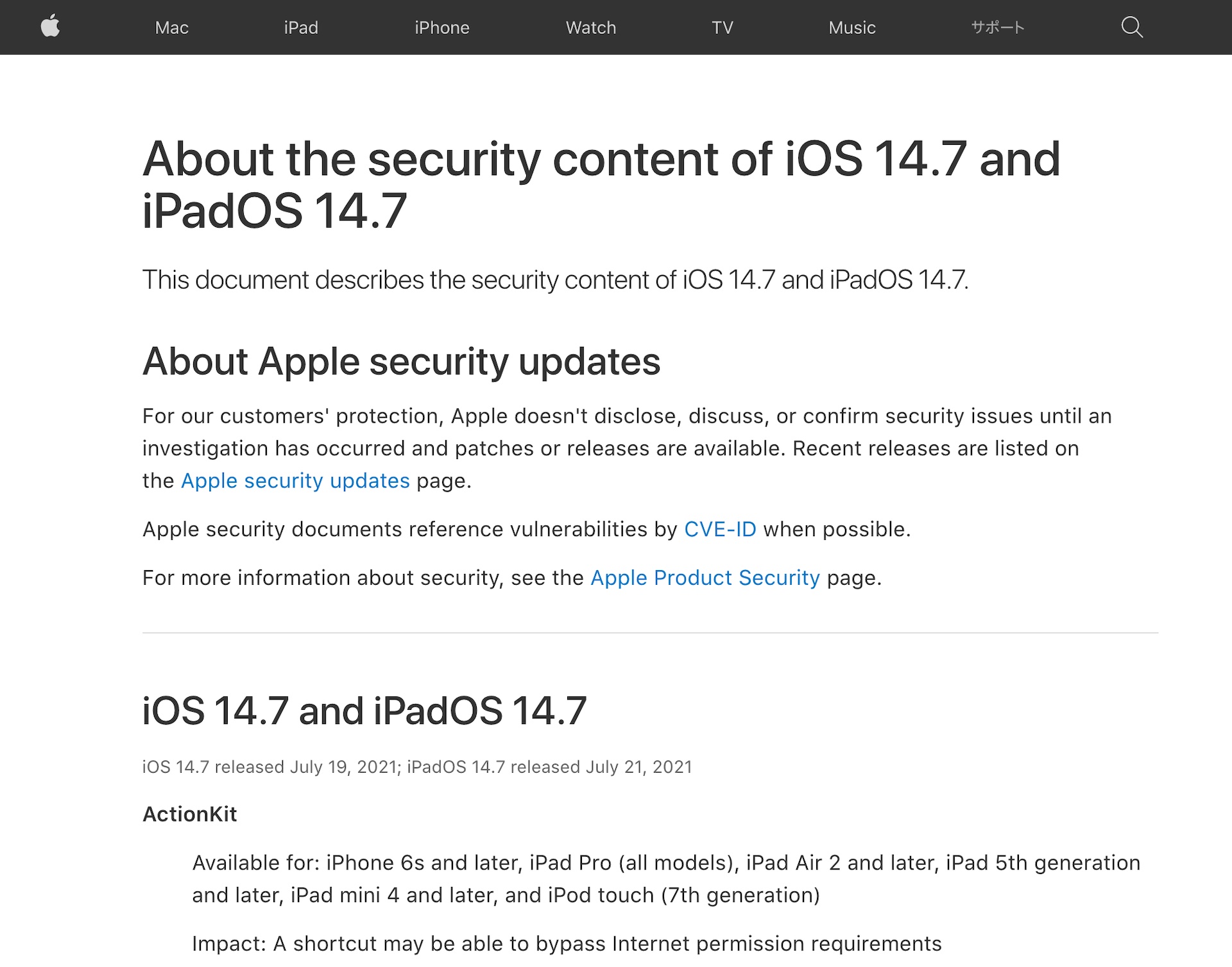 ・iOS 14.7 および iPadOS 14.7 のセキュリティコンテンツについて - Apple サポート