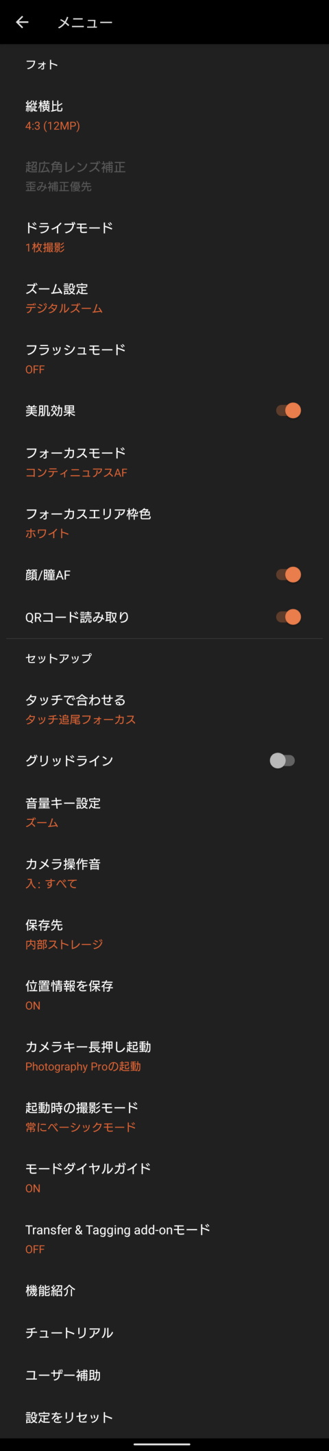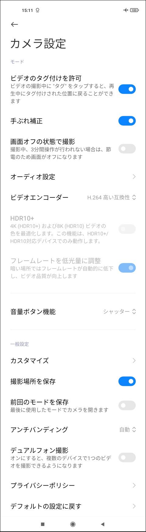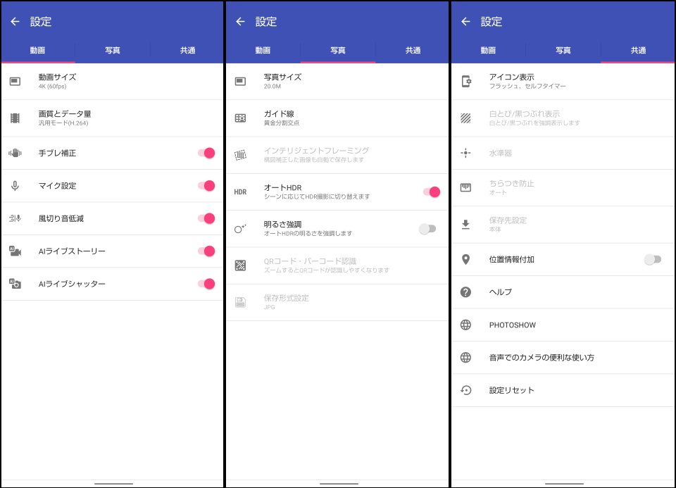 設定画面は独自デザインだが、「動画」「写真」「共通」の各項目にまとめられたページが横にスクロールするタイプで見やすくわかりやすい。