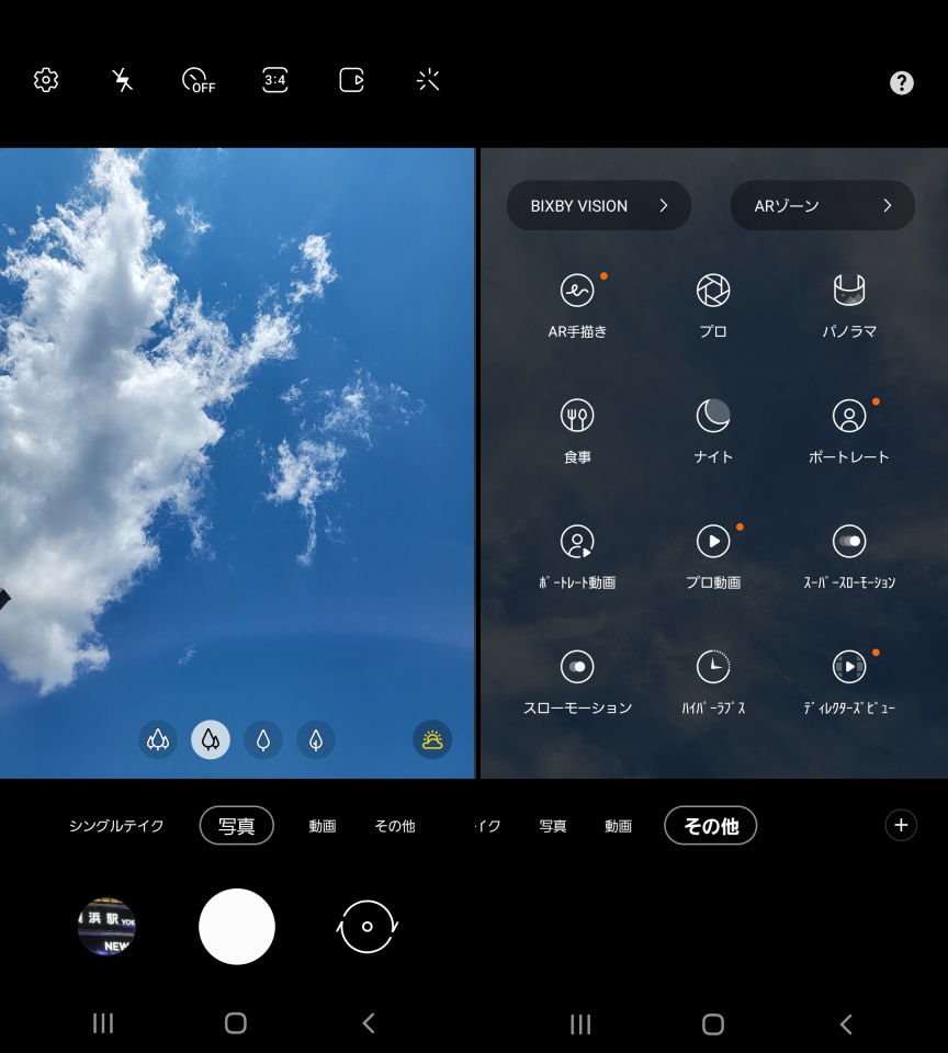 シャッターボタン上のダイヤルは「シングルテイク」「写真」「動画」「その他」の切り替えが可能。「その他」には「AR手描き」「プロ」「パノラマ」「食事」「ナイト」「ポートレート」「ポートレート動画」「プロ動画」「スーパースローモーション」「スローモーション」「ハイパーラプス」「ディレクターズビュー」の撮影モードの他に「BIXBY VISION」「ARゾーン」の起動もできる。