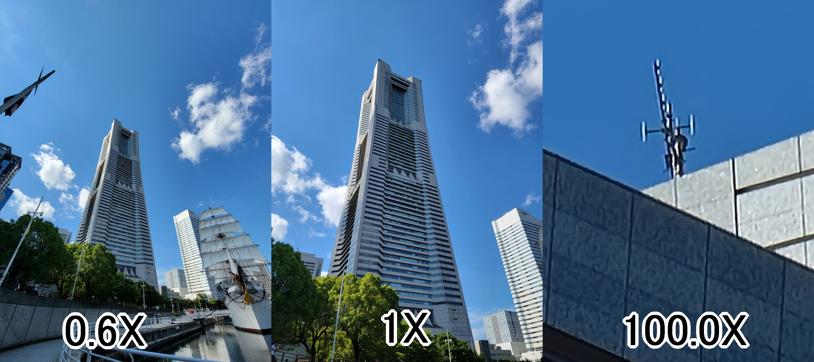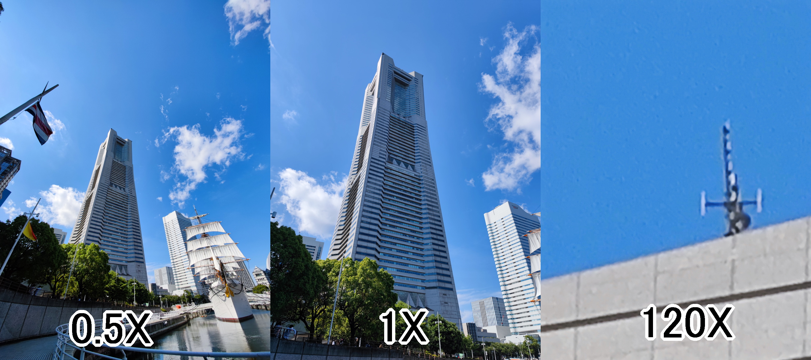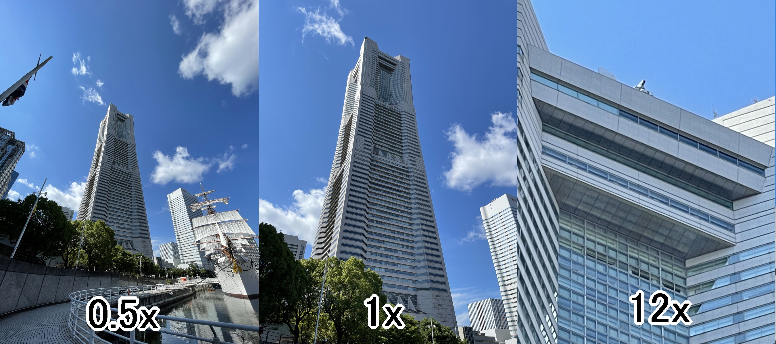 ここからは、実際に撮影した写真を紹介していこう。今回は、日中の横浜で撮影した高層ビル(横浜ランドマークタワー)や周辺の風景の写真を紹介する。横浜ランドマークタワーの写真は、「超広角」「等倍」「最大ズーム」の3枚を横に並べ1枚の画像にした。なお、すべての画像はクリック(タップ)で拡大表示する。・Xperia 1 III