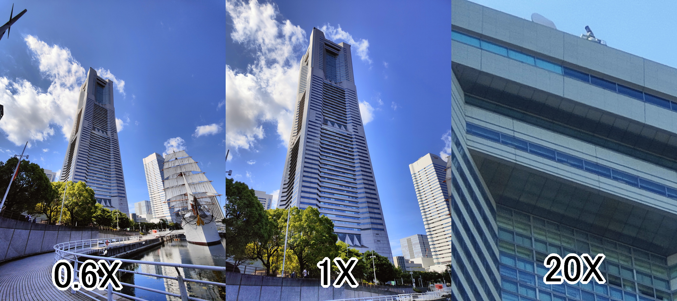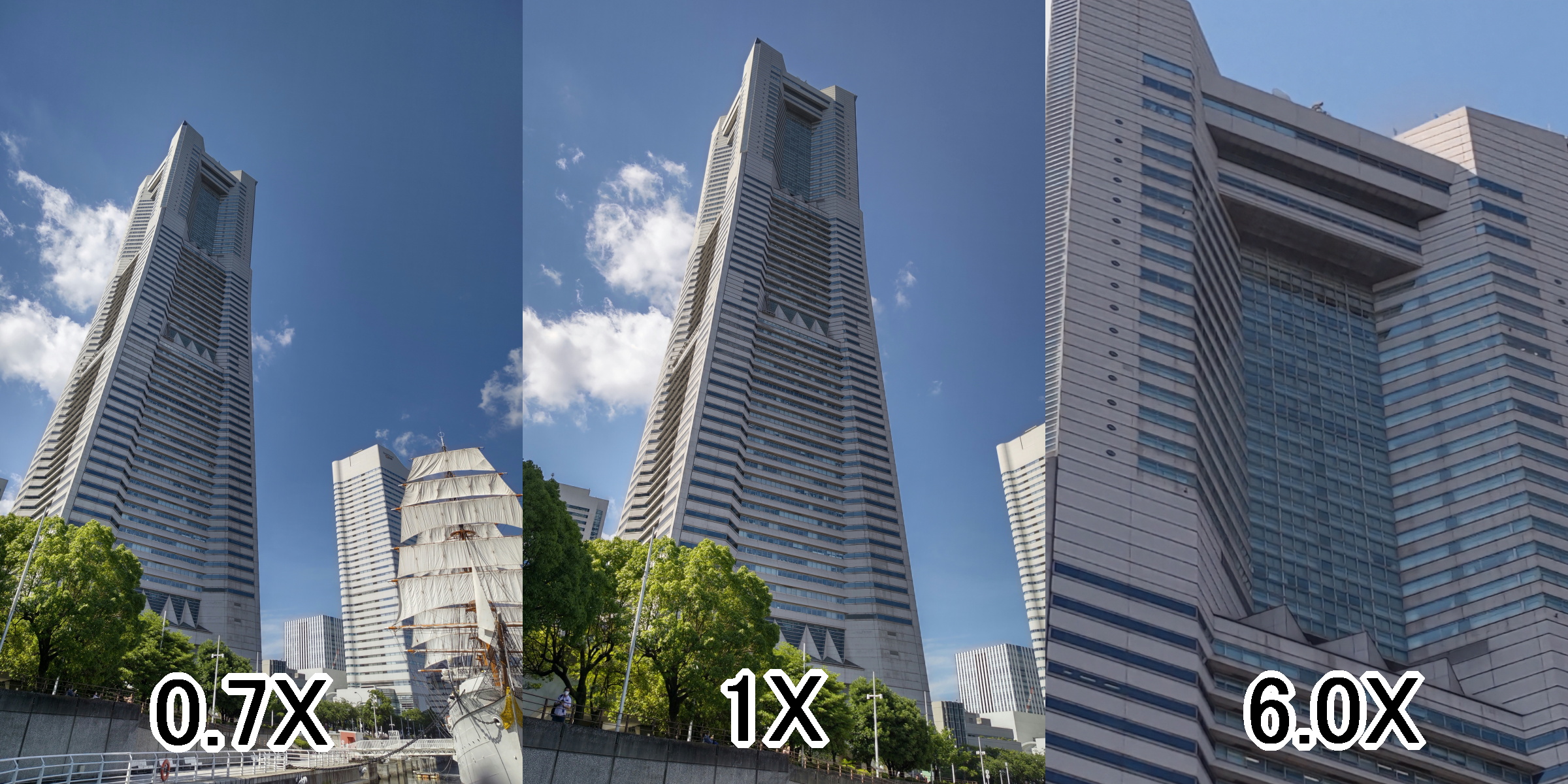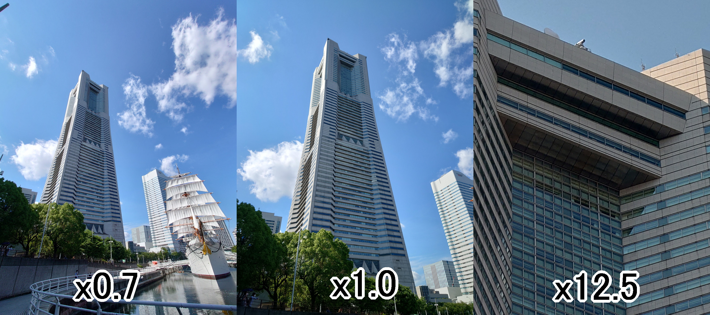 ここからは、実際に撮影した写真を紹介していこう。今回は、日中の横浜で撮影した高層ビル(横浜ランドマークタワー)や周辺の風景の写真を紹介する。横浜ランドマークタワーの写真は、「超広角」「等倍」「最大ズーム」の3枚を横に並べ1枚の画像にした。なお、すべての画像はクリック(タップ)で拡大表示する。・Xperia 1 III