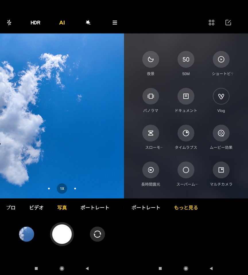 撮影画面のシャッターボタン上のダイヤルは「プロ」「動画」「写真」「ポートレート」「もっと見る」が並び、「もっと見る」内には「夜景」「50M」「ショートビデオ」「パノラマ」「ドキュメント」「Vlog」「スローモーション」「タイムラプス」「ムービー効果」「長時間露光」「スーパームーン」「マルチカメラ」「クローン」および「編集」アイコンが並び、各モードの切り替えができる。