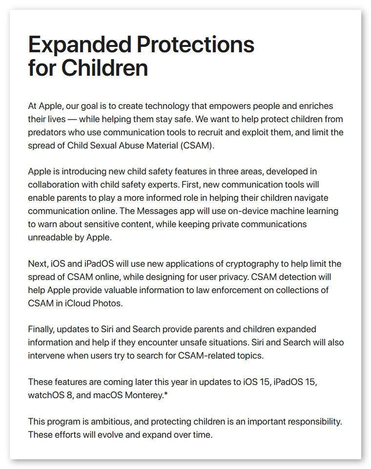 ニュースタイトルを見た瞬間にはにわかに信じがたく「どうせセンセーショナルなタイトルでPVを稼ぎたいだけだろう」とライター特有の穿った気持ちで記事を読んでみれば、内容はほぼ上記のままで、Appleが米国内における子どもへの性的虐待などを防止する目的として、iPhoneなどの端末内の児童ポルノ画像を自動検出するAI技術「NeuralHash」を実用化するというものでした。