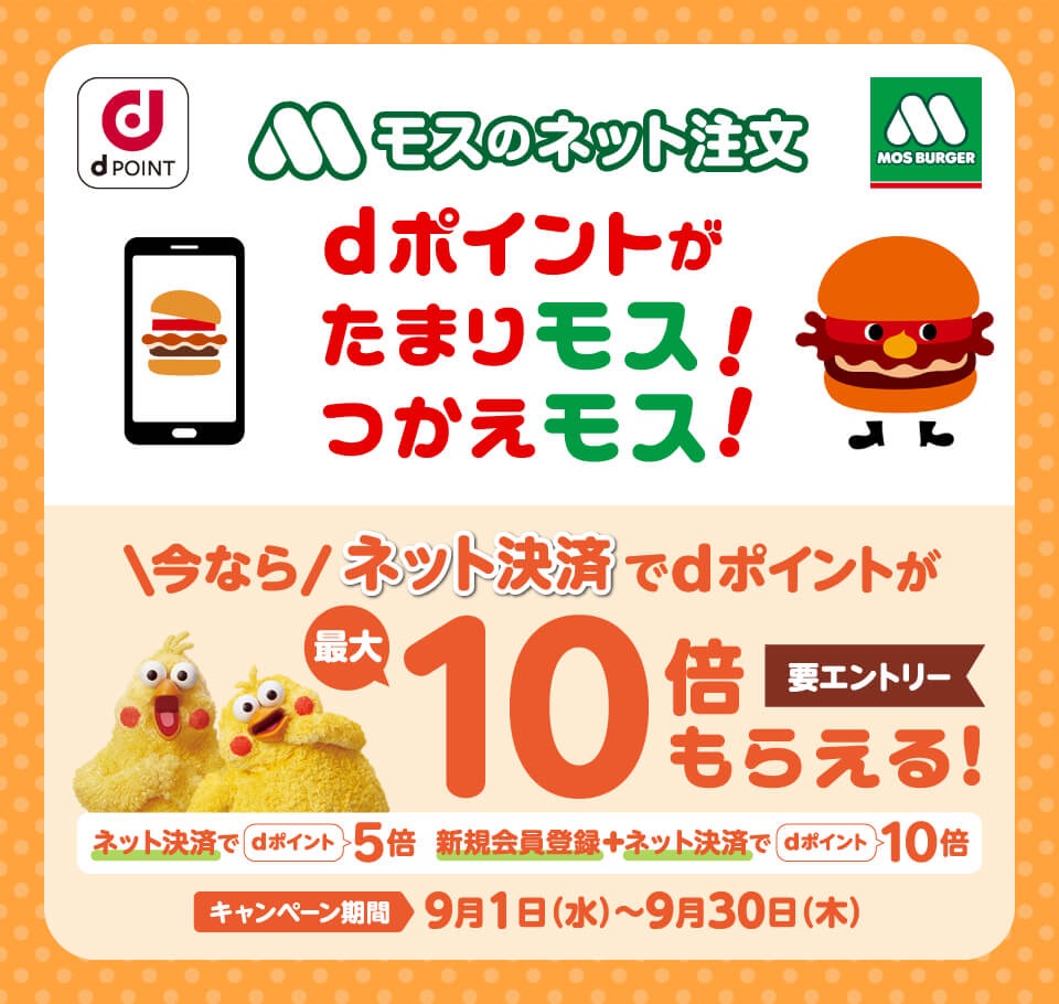 導入開始を記念して2021年9月1日(水)0:00~9月30日(木)23:59まで「モスのネット注文」でもdポイントがたまりモス!つかえモス!dポイント最大10倍キャンペーン!」( https://dpoint.jp/cp_2/mos-burger_210901_2418/index.html )が実施され、エントリーの上でdポイントカードをモスのネット注文に登録してネット決済で支払うと通常の5倍のdポイント(用途・期間限定)が進呈されます。