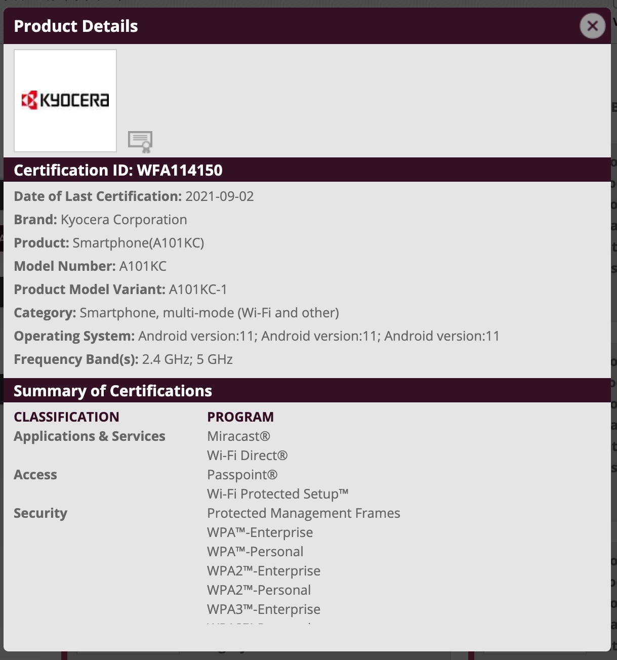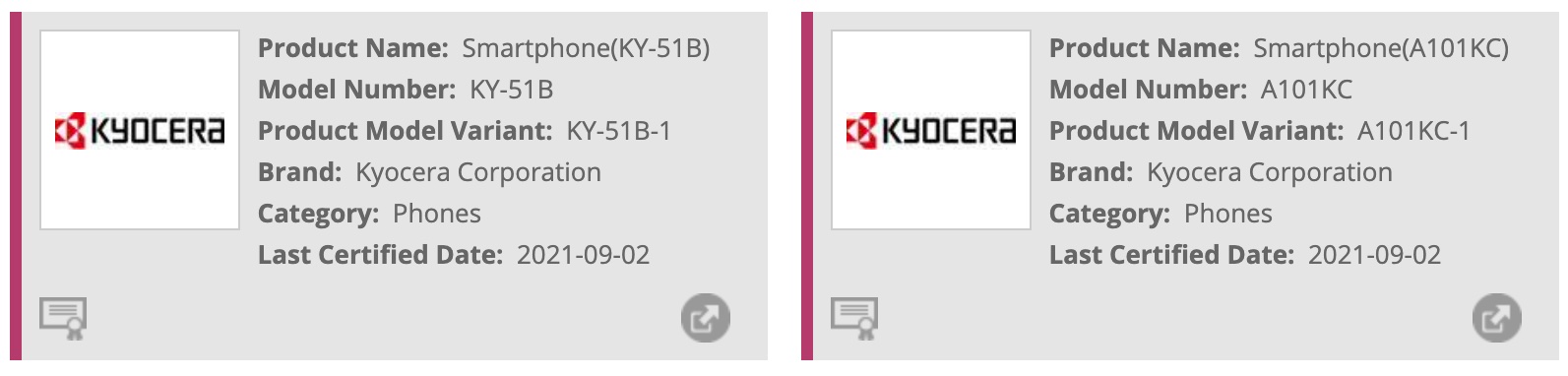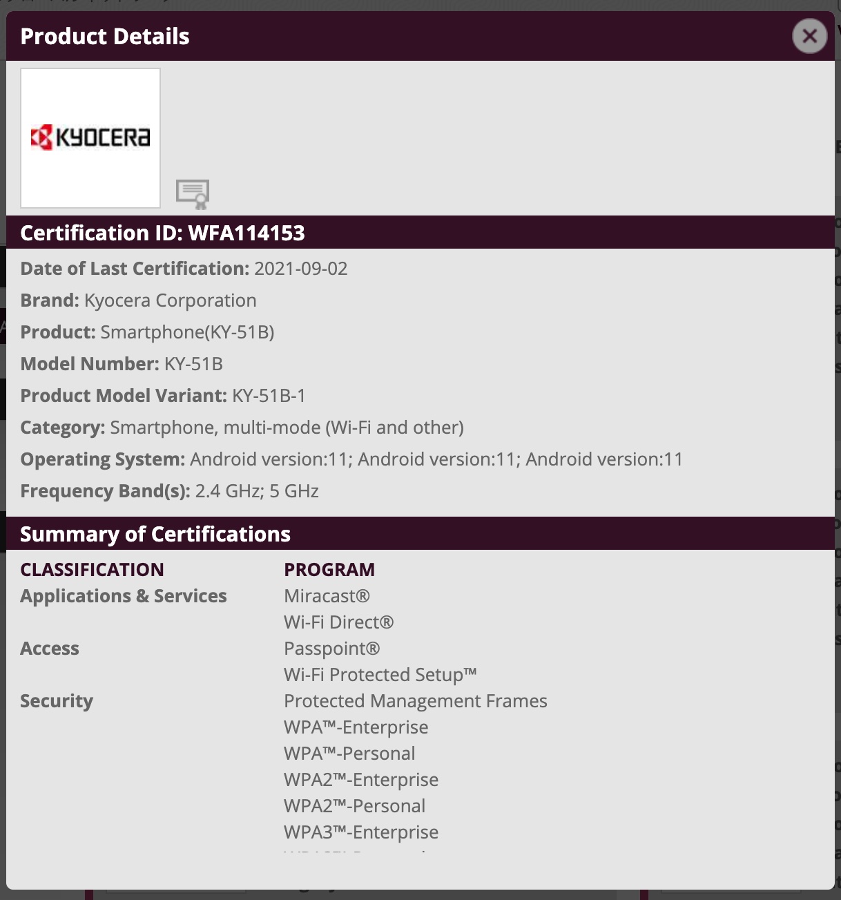 Wi-Fi Allianceが京セラ製の未発表のスマートフォン(スマホ)「KY-51B」と「A101KC」の認証をカテゴリー「Phone」で2021年9月2日(木)付で公開しています。Certification IDはKY-51Bが「WFA114153」、A101KCが「」。