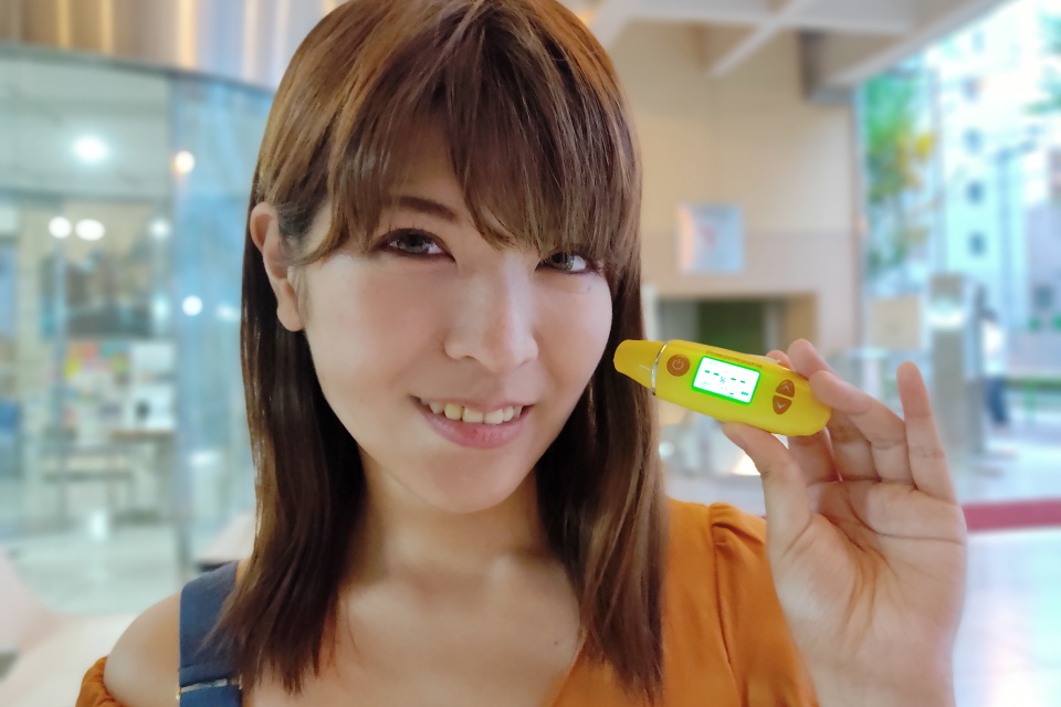 | 手軽に肌診断ができるスキンチェッカーを紹介!(モデル:有里彩さん、撮影:筆者) |