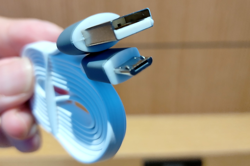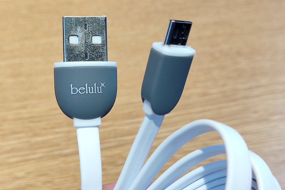 同梱するmicroUSBケーブルのケーブル部分は高耐久といわれている平型のきしめんタイプで、長さは1メートル弱と案外長めだ。USB Type-A側には「belulu」のロゴがある。