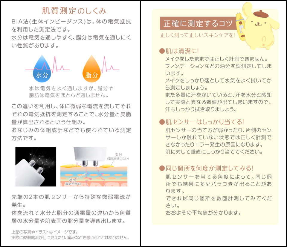 直接肌に当てて微弱な電流を流すという仕組みのため、メイクをしたままはもちろん、肌に何かを付着させた状態や多量の汗をかいた状態では正しく測定できない。水気をしっかり拭いてすっぴん状態で計測することが望ましい。