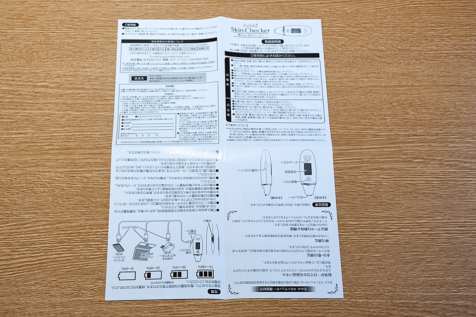 本体、microUSBケーブル、保証書付き取扱説明書の3点がすべての内容物だ。保証書付き取扱説明書の裏面は色付きでディスプレイ表示をはじめ、水分や脂分量の理想的な目安、操作方法などが細かく記載されている。全体的に文字が多いように感じるが、文字のサイズは小さくはないので、見やすい印象だ。