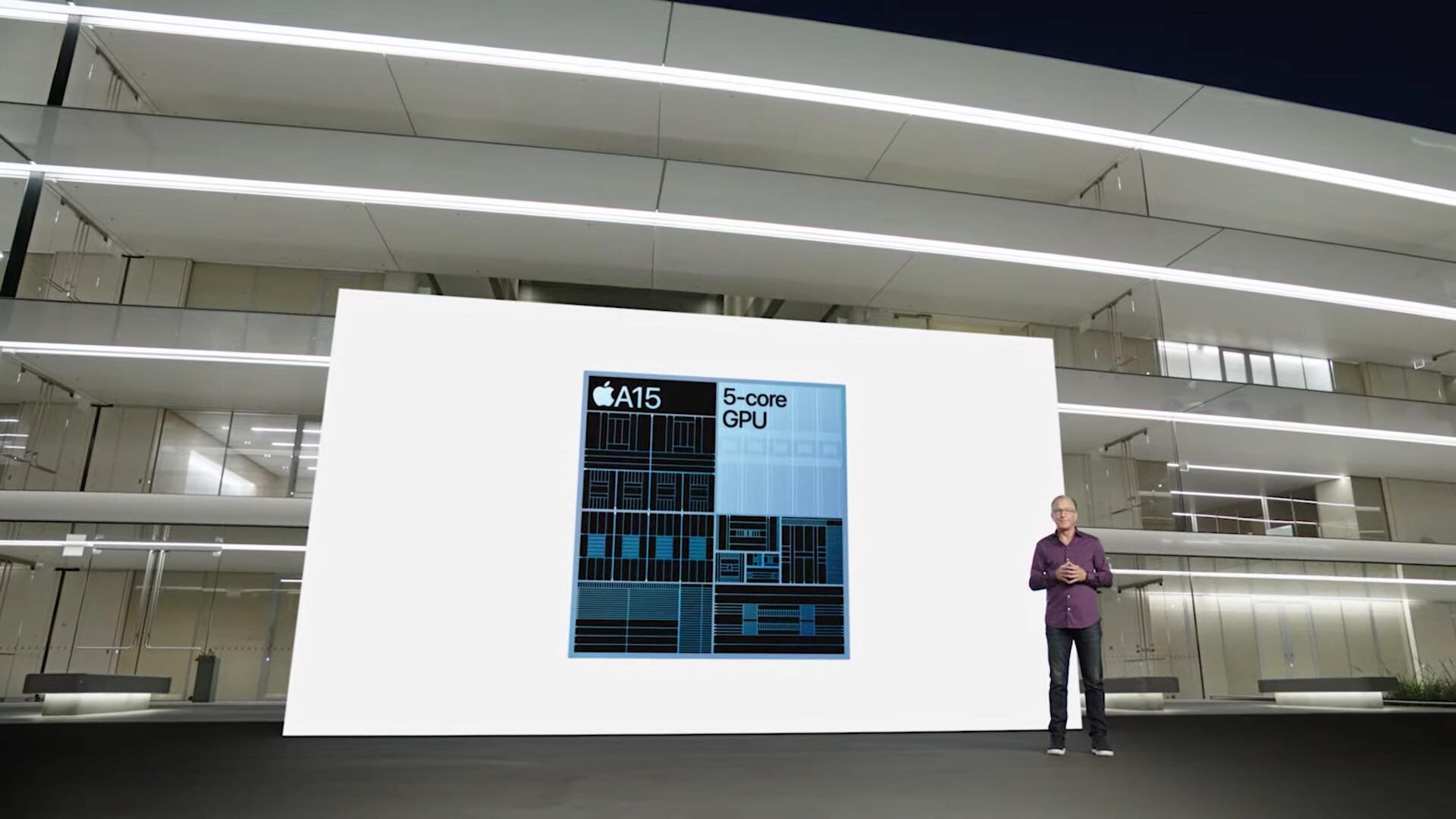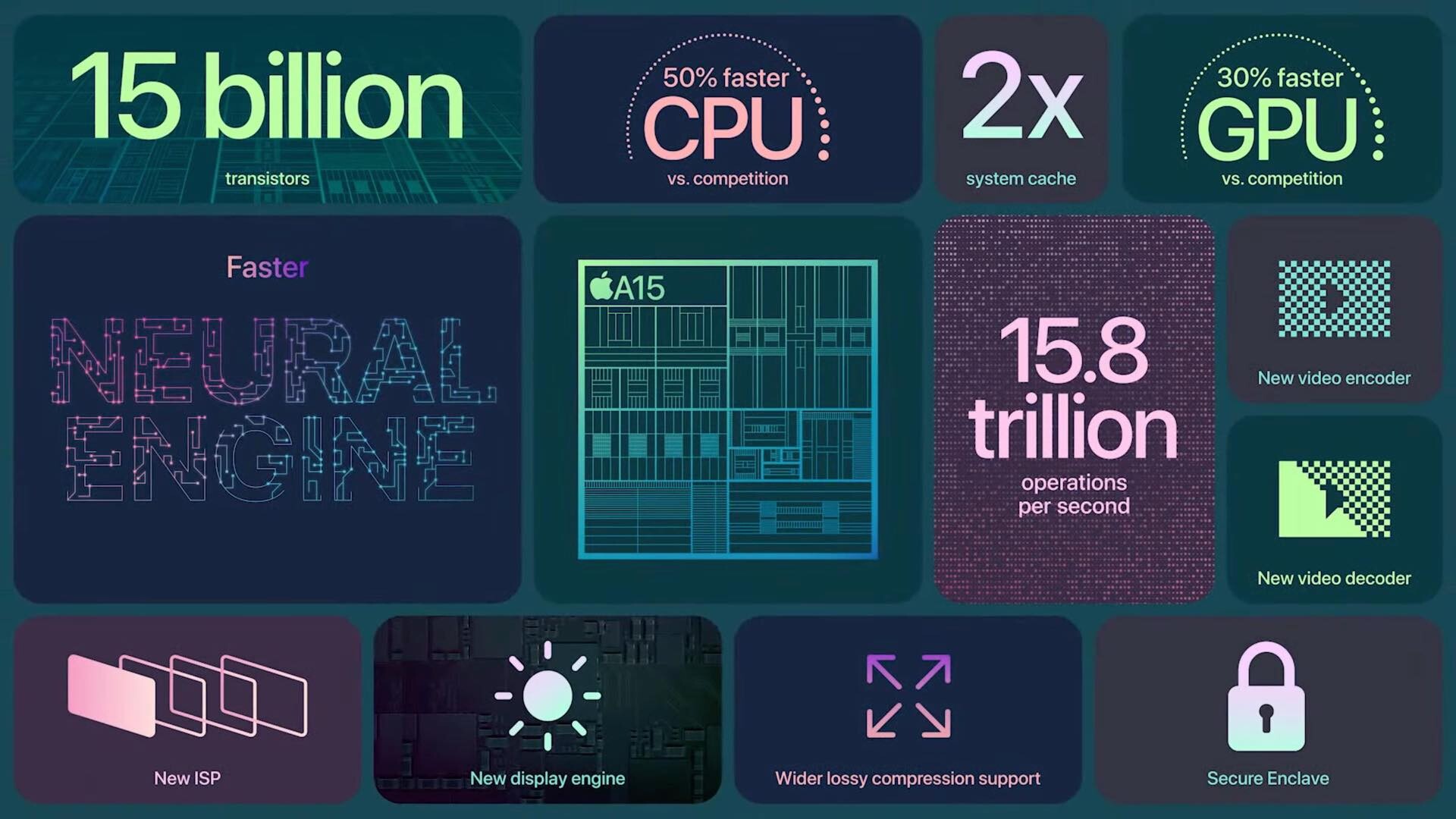 Apple A15 Bionicは5nmプロセスで製造され、150億のトランジスターを内蔵し、他のスマホよりも50%高速な6コアCPU(高性能な2コア+省電力な4コア)、通常モデルは4コアGPUで30%高速なグラフィック性能となり、16コアNE(Neural Engine)やMLアクセラレーターを搭載して15兆8千億回/秒の処理が可能となっています。