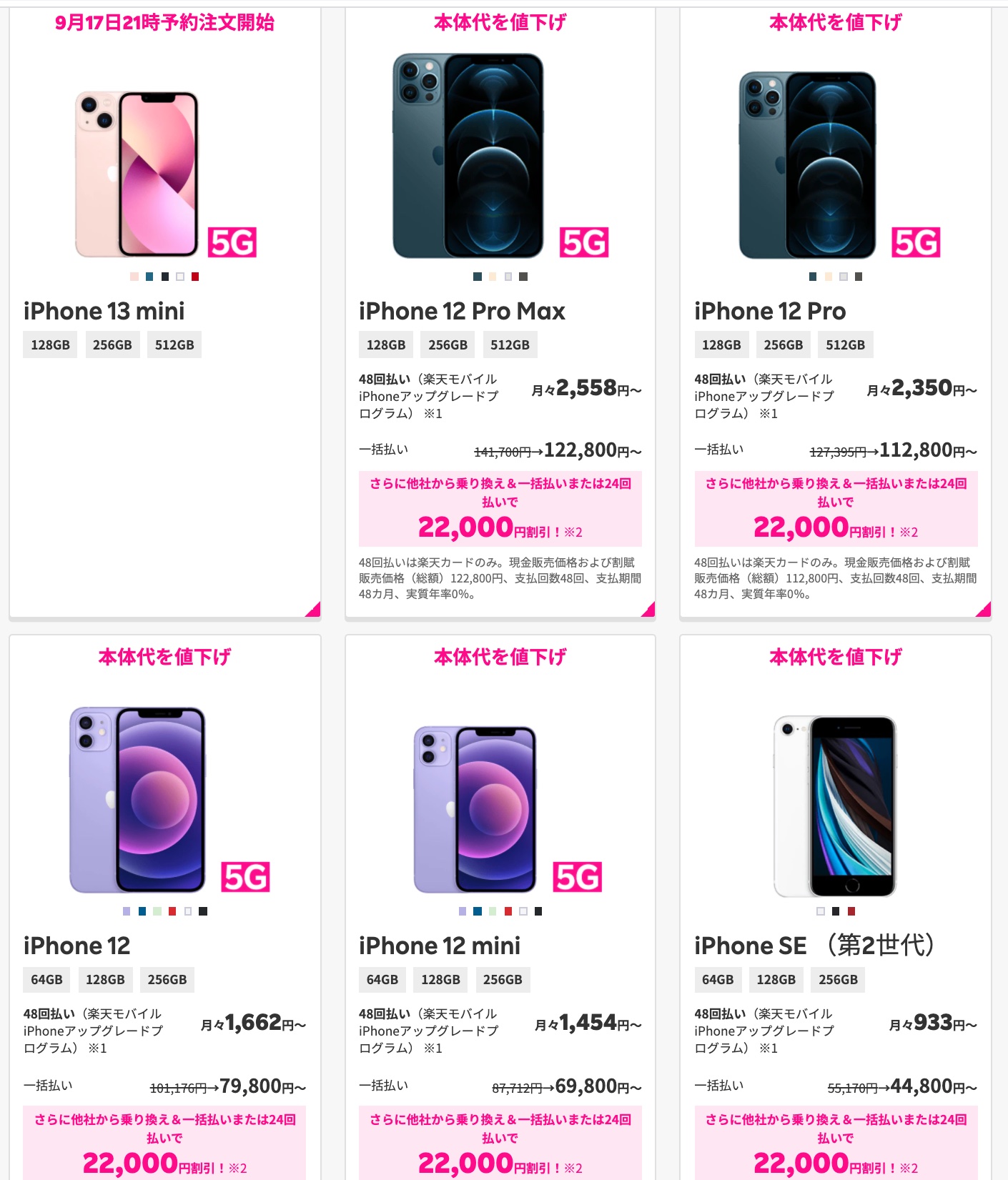 楽天モバイルは16日、同社が販売するスマートフォン(スマホ)「iPhone 12 mini」および「iPhone 12」、「iPhone 12 Pro」、「iPhone 12 Pro Max」、「iPhone SE(第2世代)」(ともにApple製)の価格を2021年9月15日(水)21時より順次値下げするとお知らせしています。