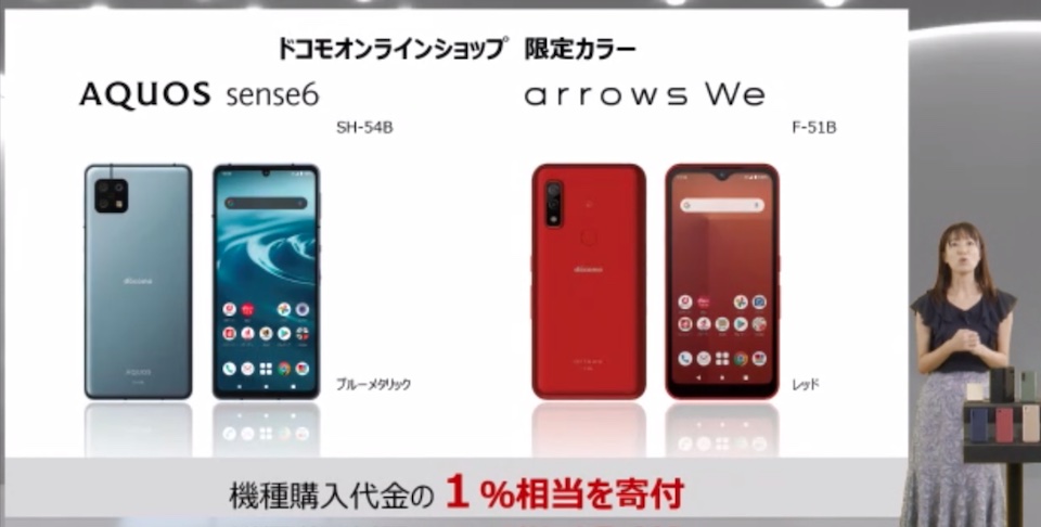 また今回、AQUOS sense6 SH-54Bとarrows We F-51Bの2機種についてはドコモオンラインショップ限定カラーが用意されており、AQUOS sense6 SH-54Bは「ブルー メタリック」、arrows We F-51Bは「レッド」が販売され、これまでと同様に新型コロナウィルス感染症(COVID-19)への対応を行っている機関(赤十字予定)へ製品代金の1%相当を寄付するということです。