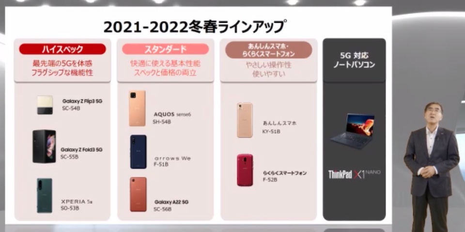 投入されるのはスマホが本日10月6日に発売された「Galaxy Z Fold3 5G SC-55B」および「Galaxy Z Flip3 5G SC-54B」のほか、ハイスペックモデルが「Xperia 5 III SO-53B」、スタンダードモデルが「AQUOS sense6 SH-54B」および「arrows We F-51B」、「Galaxy A22 5G SC-56B」、シニアなど向けモデルが「あんしんスマホ KY-51B」および「らくらくスマートフォン F-52B」、ノートPCが「ThinkPad X1 Nano」となっています。