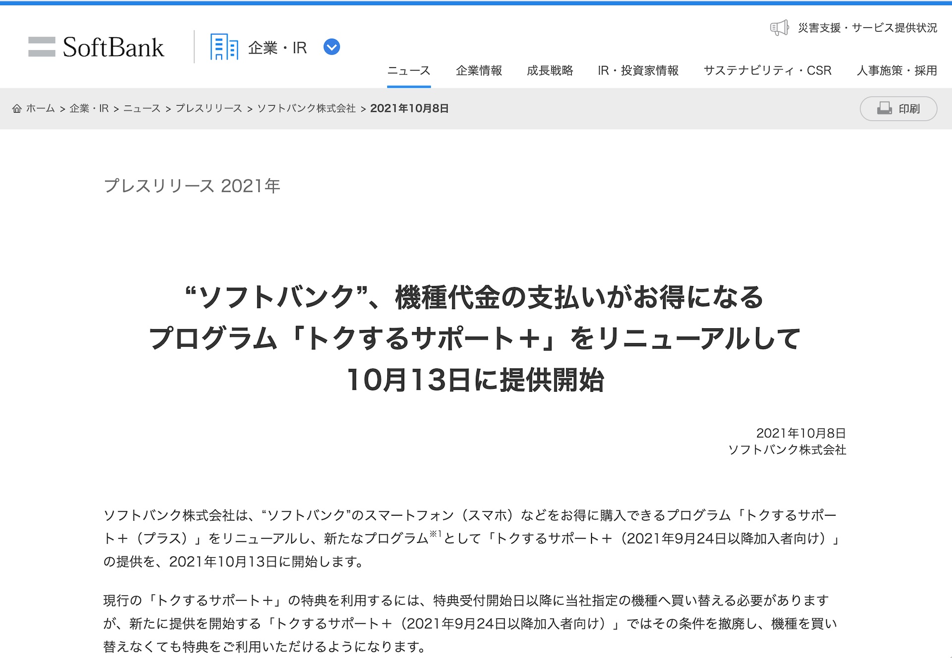 ・“ソフトバンク”、機種代金の支払いがお得になるプログラム「トクするサポート+」をリニューアルして10月13日に提供開始 | プレスリリース | ニュース | 企業・IR | ソフトバンク