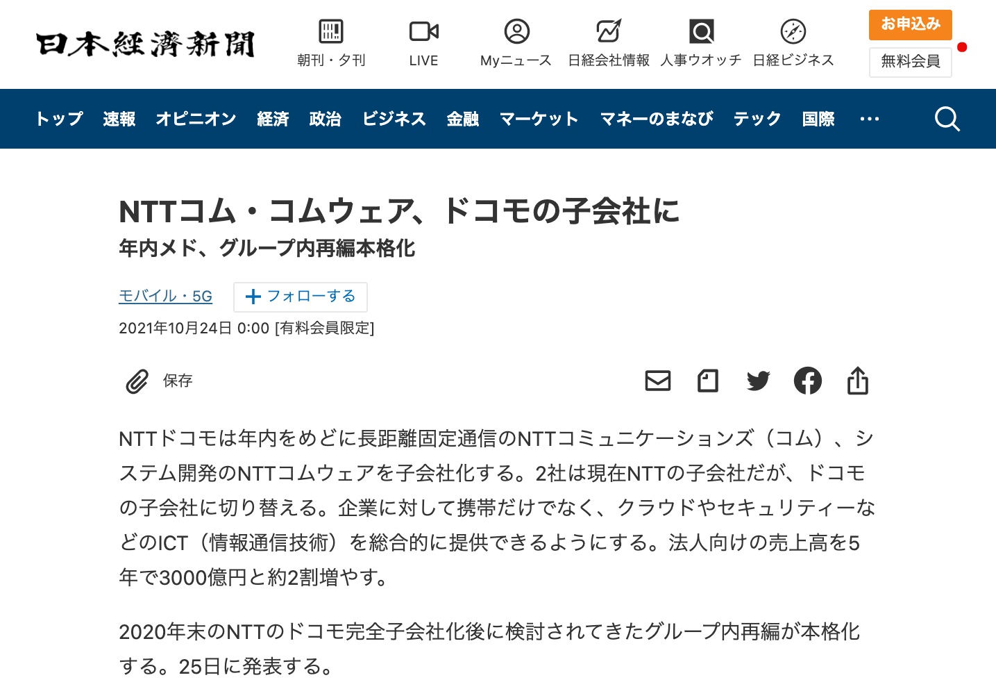 日本経済新聞は24日、NTTドコモが年内をめどにNTTコミュニケーションズおよびNTTコムウェアを子会社化すると報道しています。10月25日(月)に発表すると伝えており、これを受け、NTTドコモでは同社が発表したものではないとしつつ、発表の準備が整い次第公表すると発表しています。