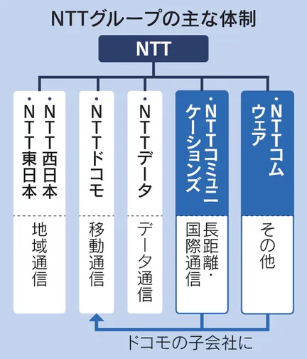 NTTグループとしてNTTコミュニケーションズは長距離固定通信や国際通信、仮想移動体通信事業者(MVNO)、NTTコムウェアはシステム開発を行っており、前述通りに現在はともにNTTの完全小会社ですが、新たにNTTドコモの子会社へ切り替わると報道されました。