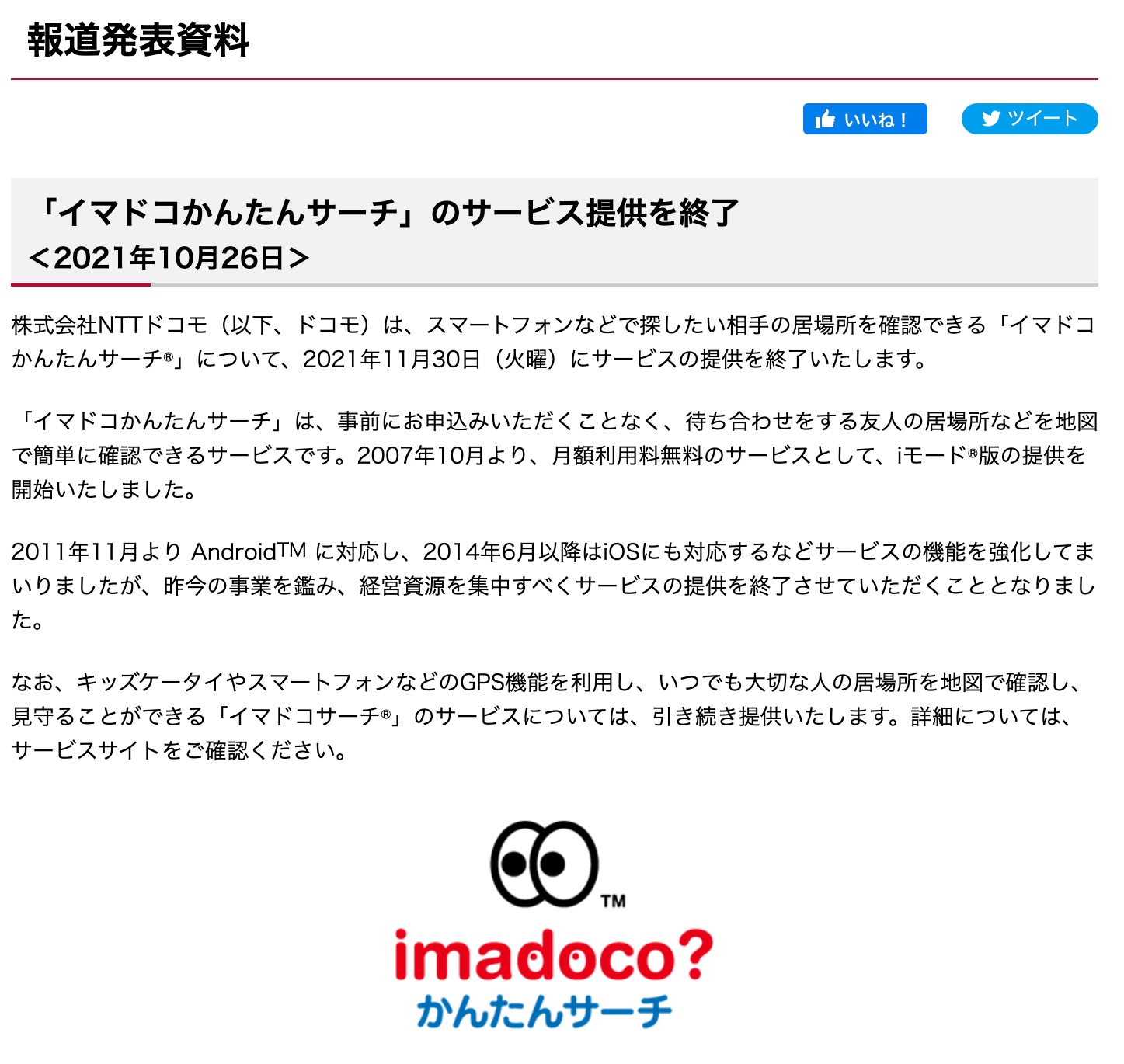 ・報道発表資料 : 「イマドコかんたんサーチ」のサービス提供を終了 | お知らせ | NTTドコモ
