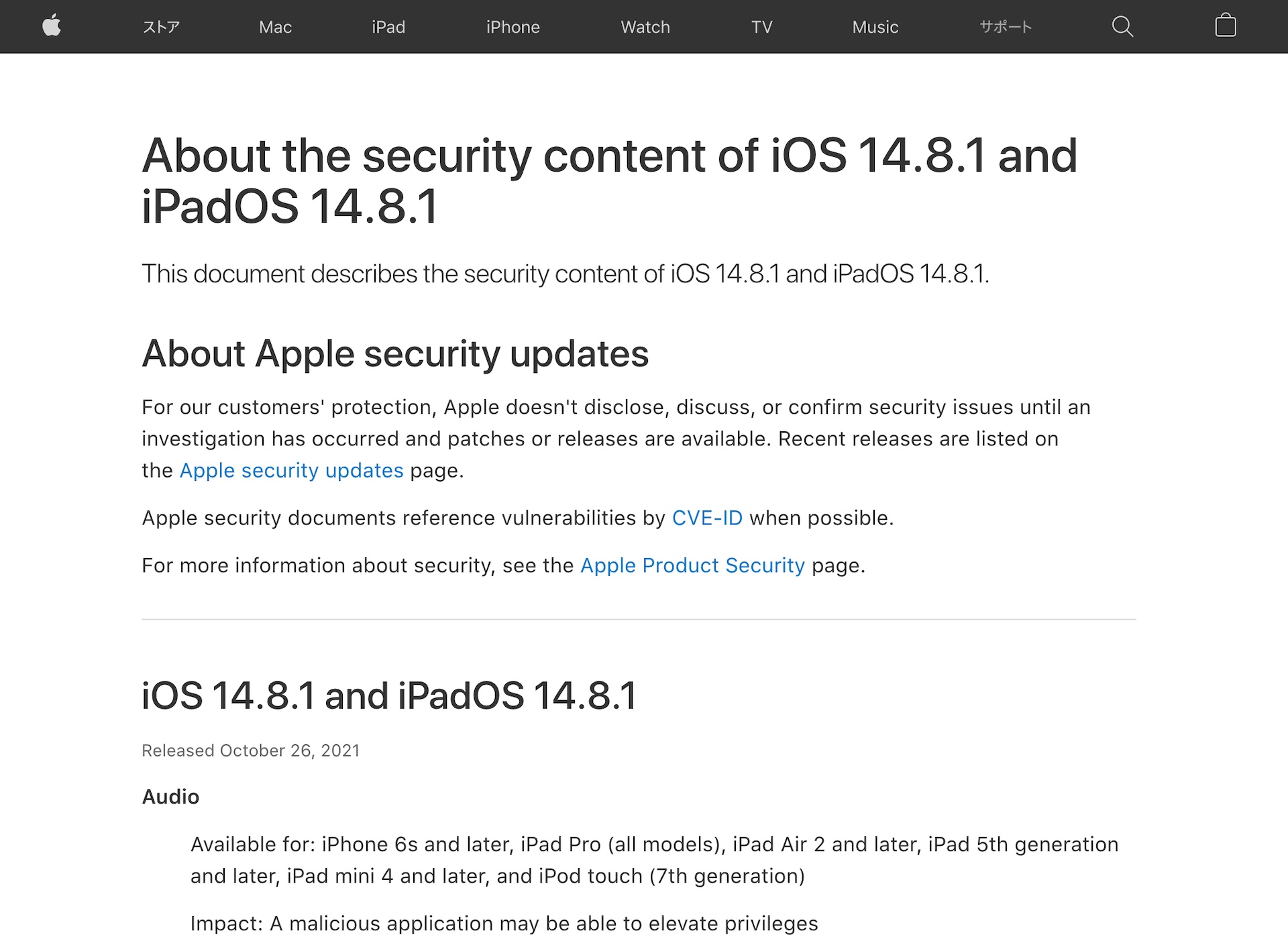 ・iOS 14.8.1 および iPadOS 14.8.1 のセキュリティコンテンツについて - Apple サポート (日本)