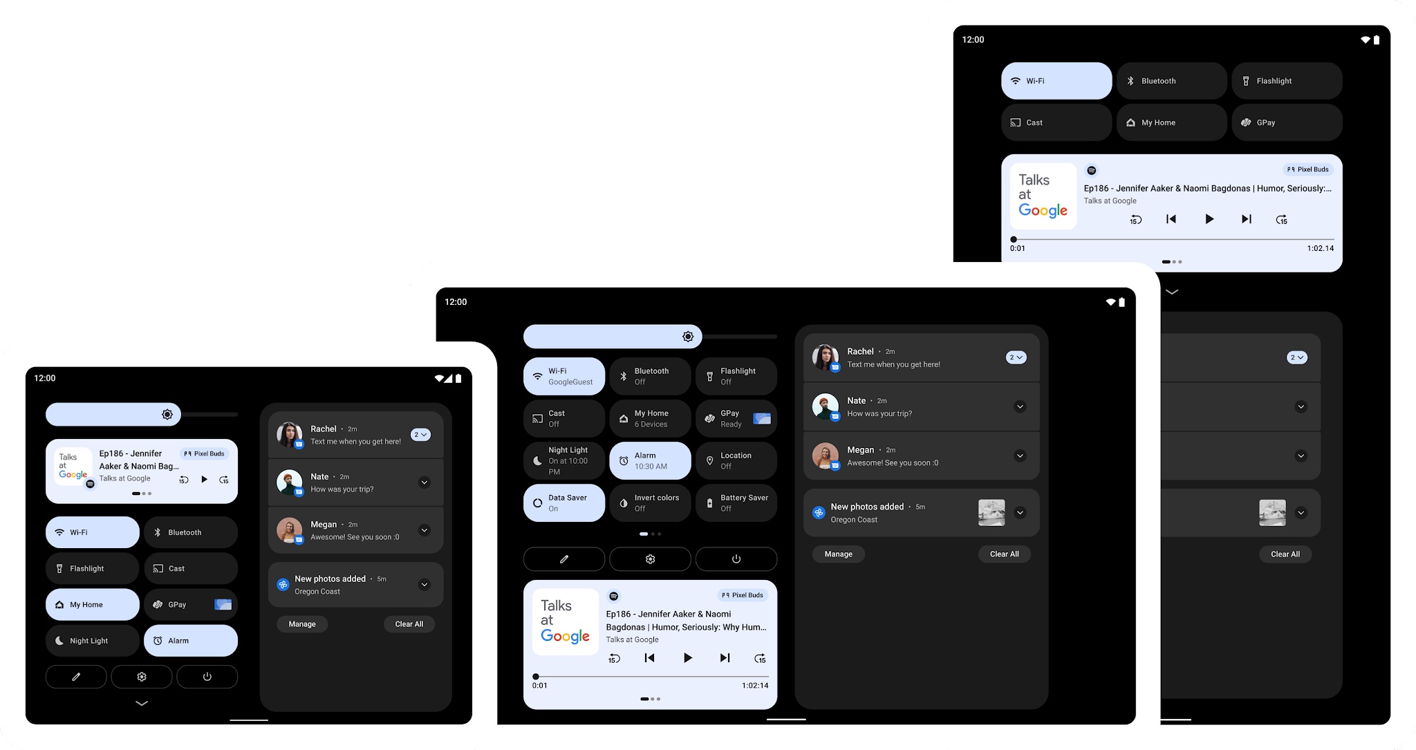 Android 12Lでは通知やクイック設定、ロック画面、アプリ切替画面、ホーム画面などを大画面に最適化したユーザーインターフェース(UI)に改良しており、例えば、600dpを超える画面では通知シェードやロック画面、その他のシステム画面は画面領域を利用するために新しい2列のレイアウトとなり、システムアプリも最適化されています。これにより、より多くを情報を表示し、使いやすくなるとのこと。