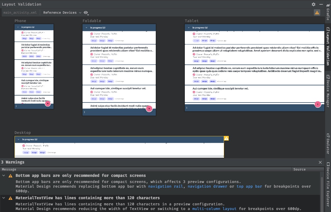 UIを大画面に適応させる方法がわからない場合に最初にできることは新しいツールを使って大画面製品に影響を与える潜在的な問題を特定することで、Android Studio Chipmunkでは影響を受けるリファレンスデバイスなどのレイアウト検証でUIの警告と提案をプロアクティブに表示するための新しいビジュアルリンティングツールに取り組んでいます。