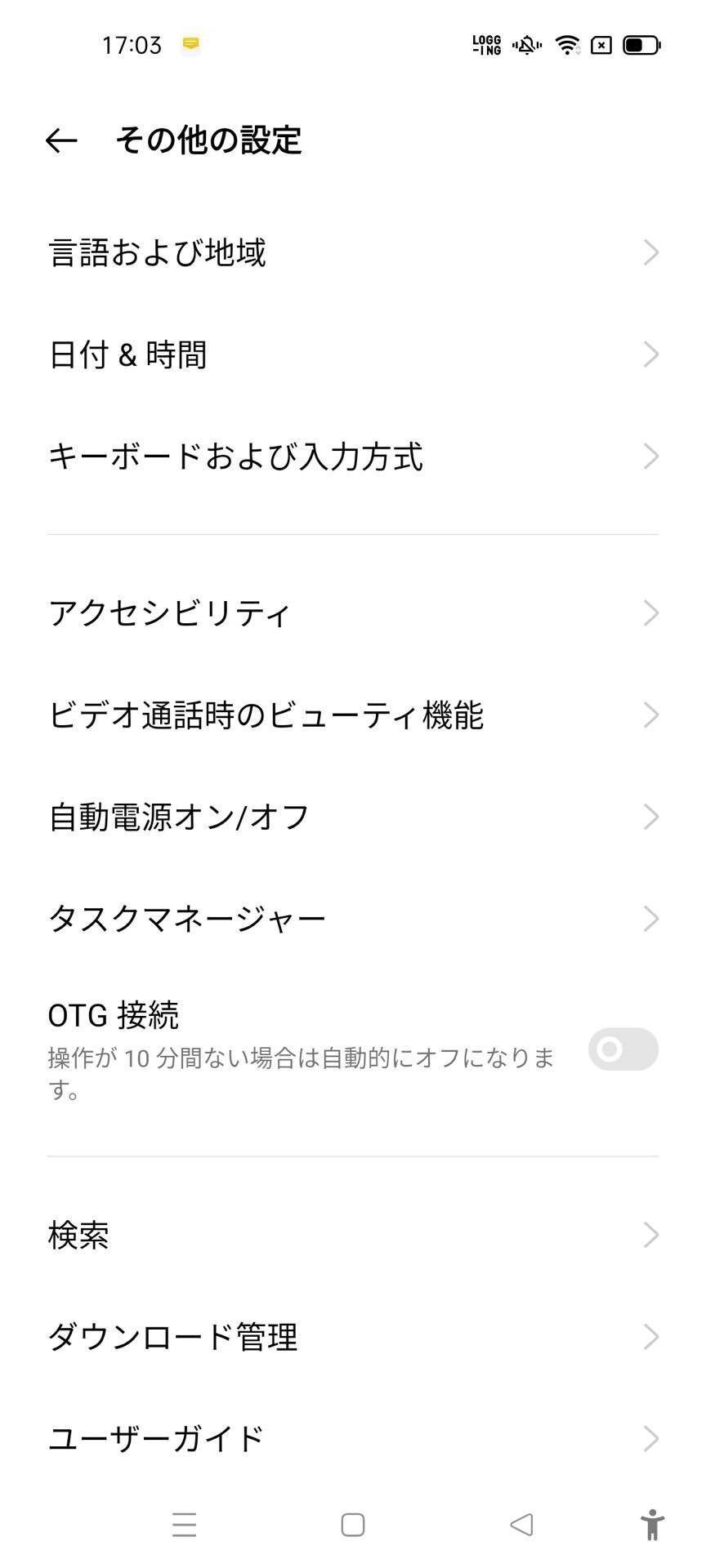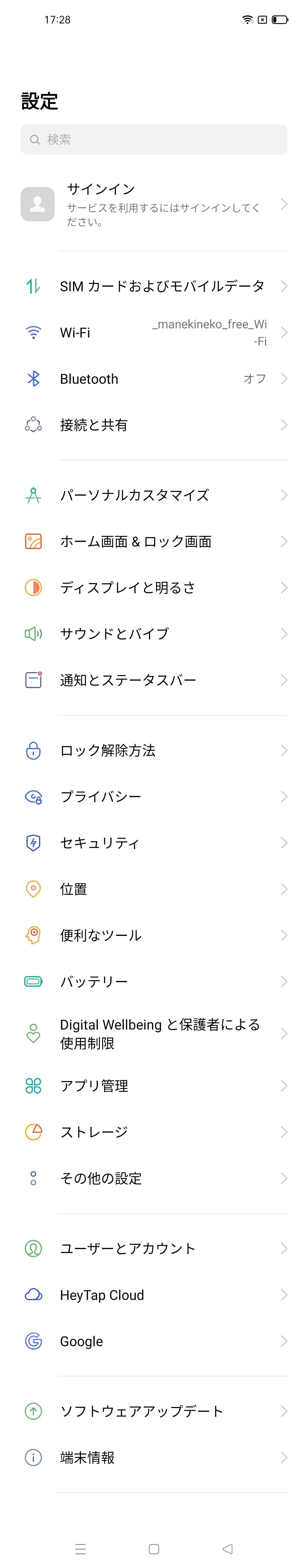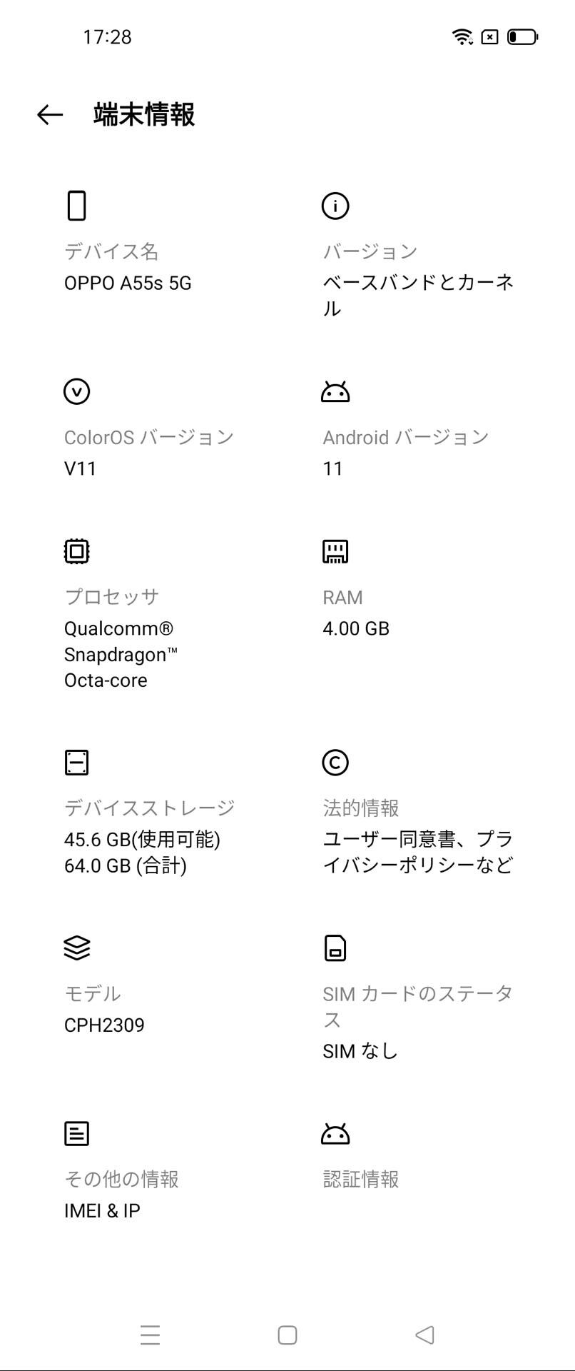 メーカー版のOPPO A55s 5G CPH2309では連続通話時間がVoLTEで約1560分、連続待受時間が4G LTEで約450時間、充電時間が約140分(OPPO 純正 AC アダプター 10W使用時)。Android 11ベースのColorOS 11となっており、デフォルトのホーム画面はアプリ一覧(いわゆる「ドロワー」)がないタイプです。