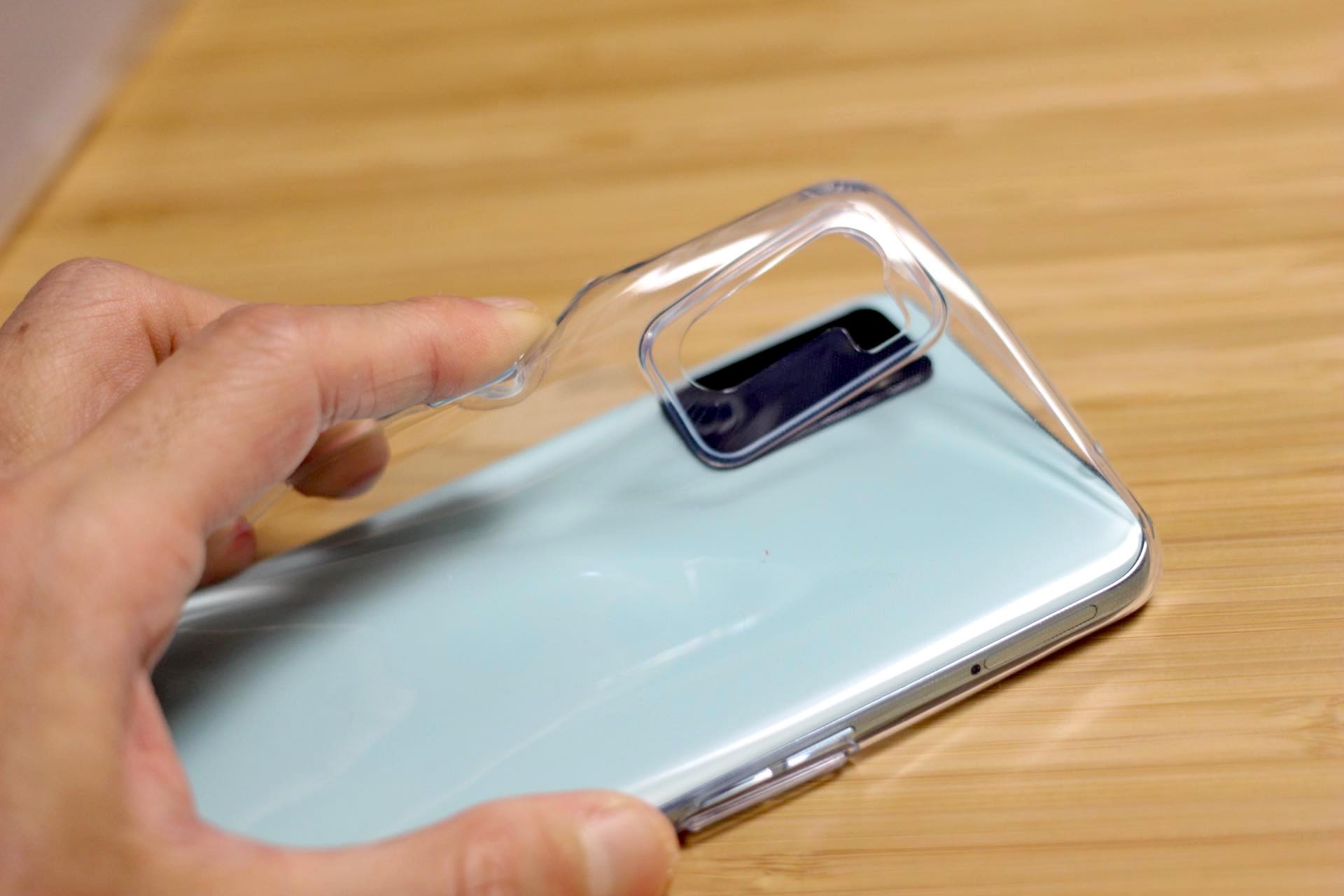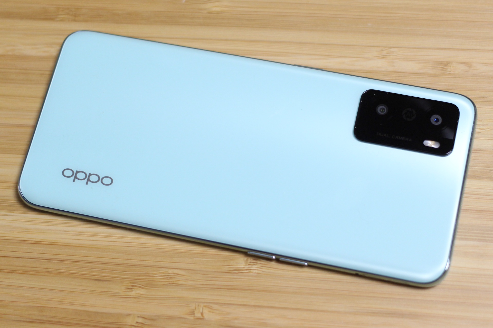OPPO A55s 5Gのグリーンの背面。ミントグリーンといった印象の淡めの色合いでサラサラした質感。何人かに見てもらいましたが、人によっては好印象、人によっては少しおもちゃっぽく安っぽく感じるようです