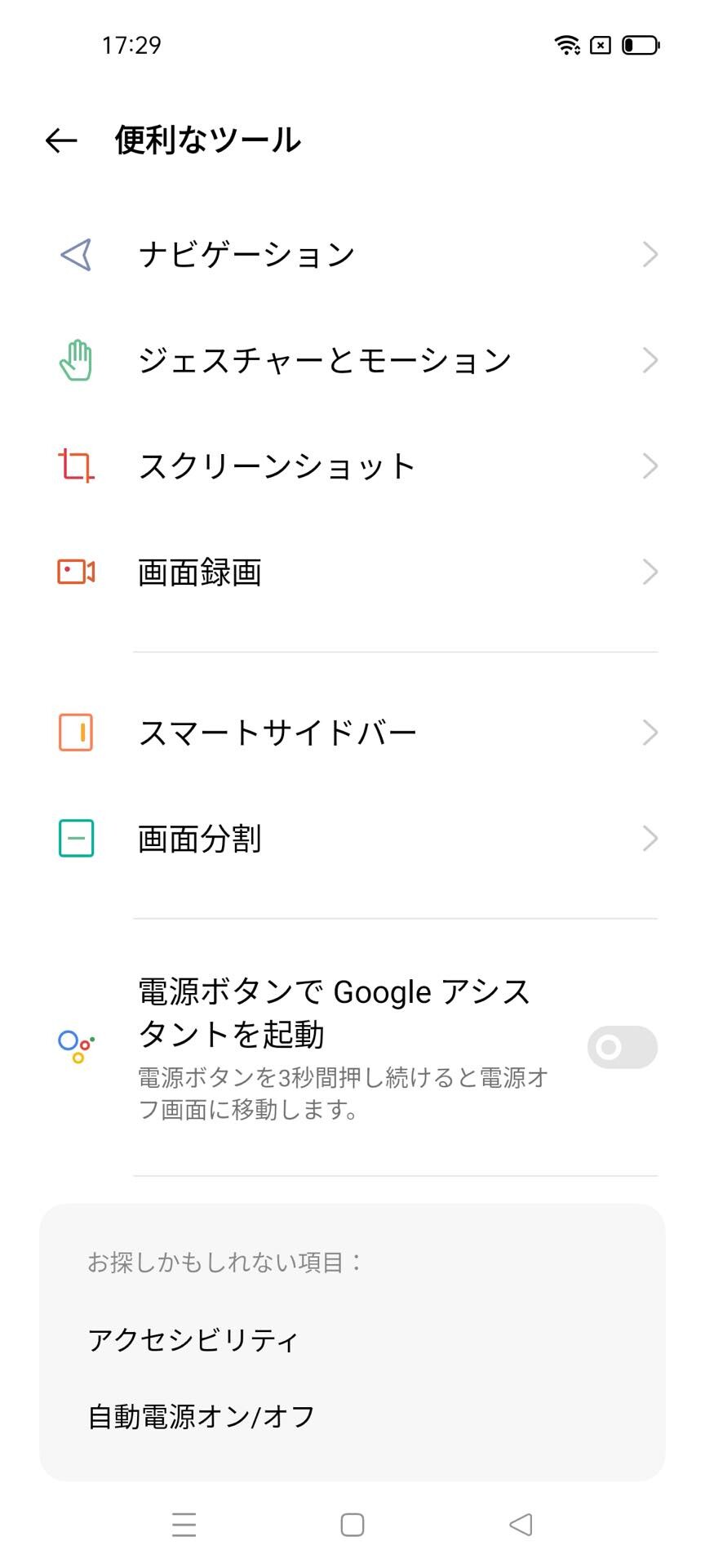 内蔵ストレージは64GBで、初期設定直後は18.4GBを使用済み。「設定」→「便利ツール」にて「スクリーンショット」や「ナビゲーション」、「ジェスチャーとモーション」、「画面録画」、「スマートサイドバー」、「画面分割」などの設定が行えます。また「電源ボタンでGoogleアシスタントを起動」をオンにすると、電源/スリープキーを3秒間押すとGoogleアシスタントが起動でき、さらに押し続けると電源メニューが表示されます
