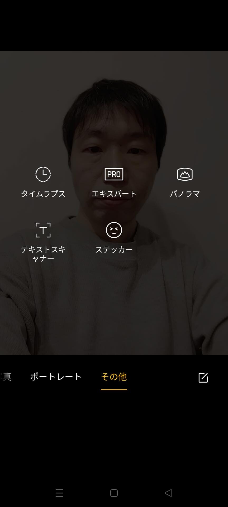 カメラ機能はモードが「写真」および「動画」、「夜景」、「ポートレート」、「その他」となっており、その他には「タイムラプス」や「パノラマ」、「エキスパート」、「テキストスキャナー」、「ステッカー」が用意されています