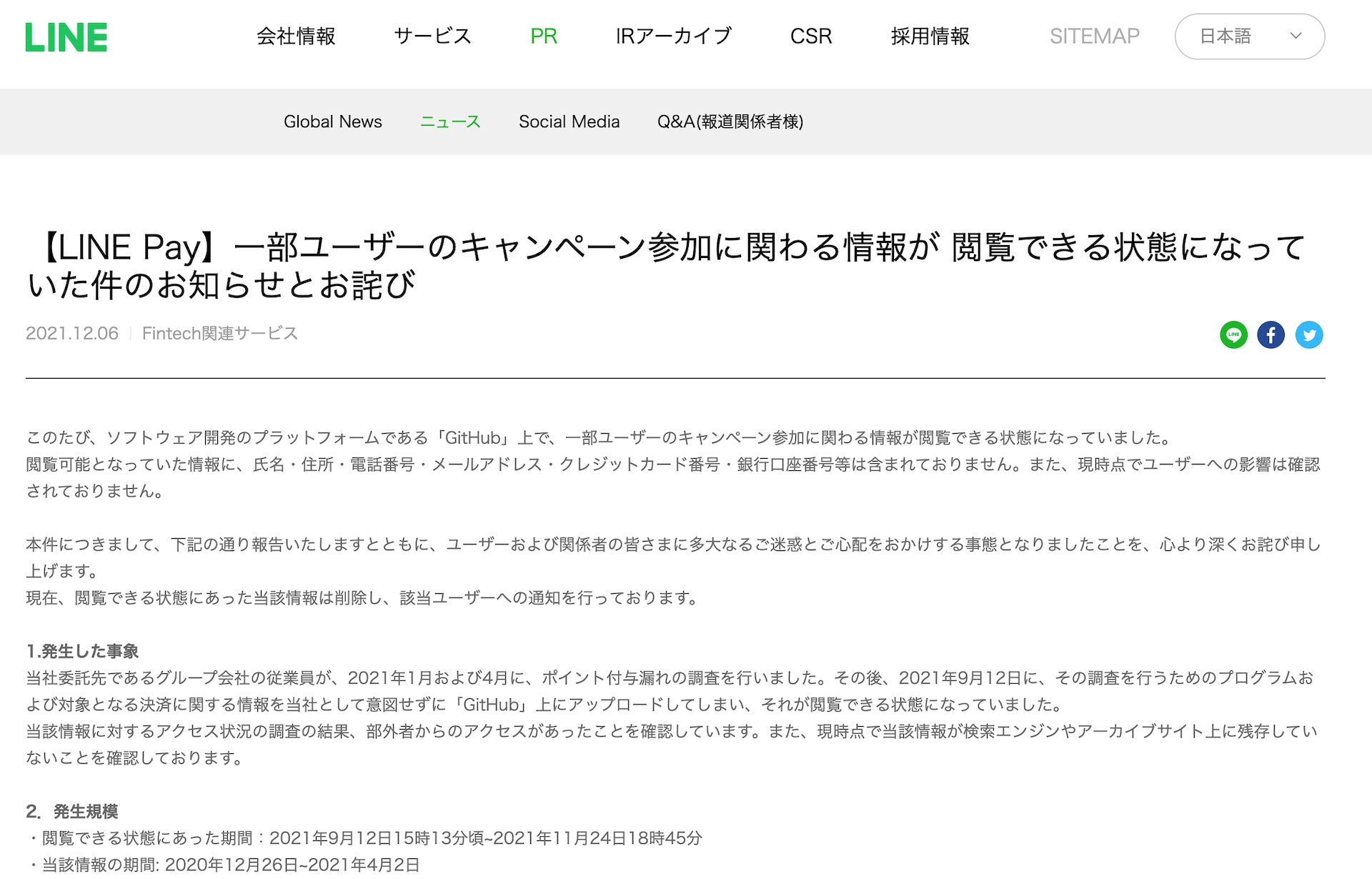 対象利用者(アカウント)数は海外のグループ会社で展開しているLINE Payを含めると13万3484アカウント、日本国内のみでは5万1543アカウント、閲覧できる状態にあった期間は2021年9月12日15時13分頃〜2021年11月24日18時45分、閲覧可能となっていた情報の当該期間は2020年12月26日〜2021年4月2日。