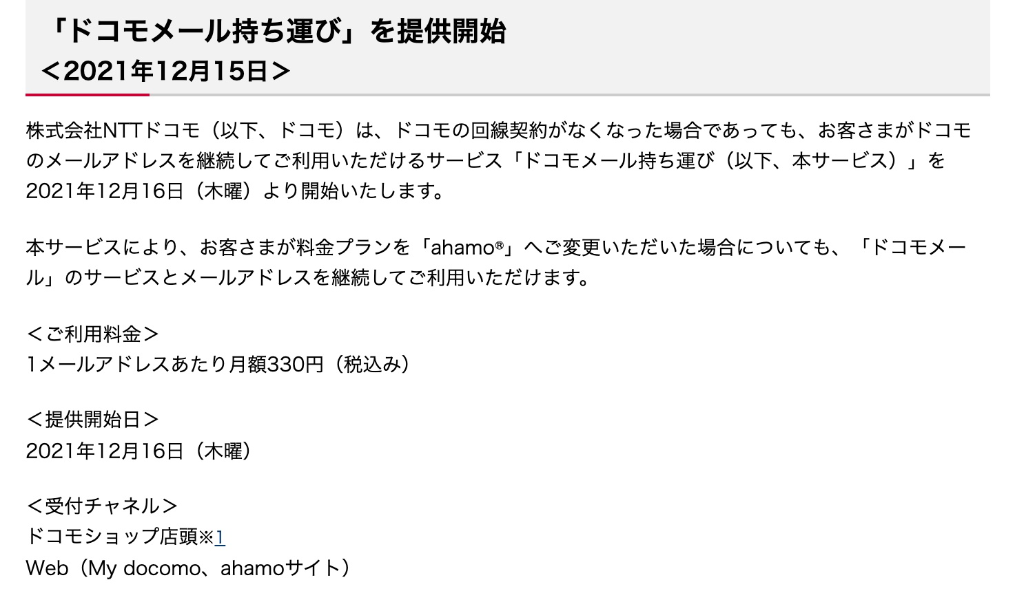 NTTドコモは15日、同社の携帯電話回線(「ahamo」除く)の契約がなくなった場合であっても「@docomo.ne.jp」ドメインのメールアドレス(いわゆる「キャリアメール」)を継続して利用できるサービス「ドコモメール持ち運び」を2021年12月16日(木)に提供開始すると発表しています。