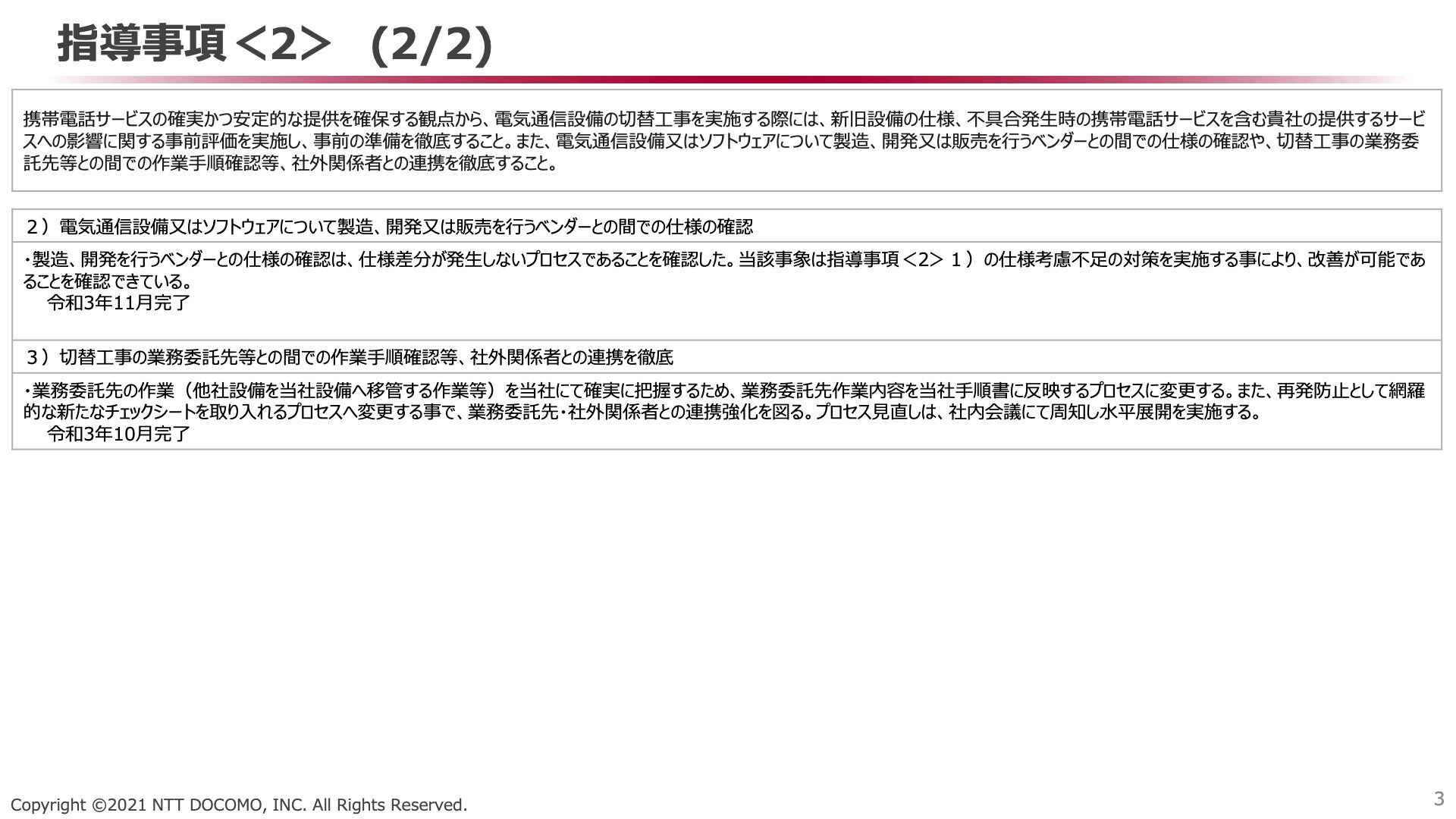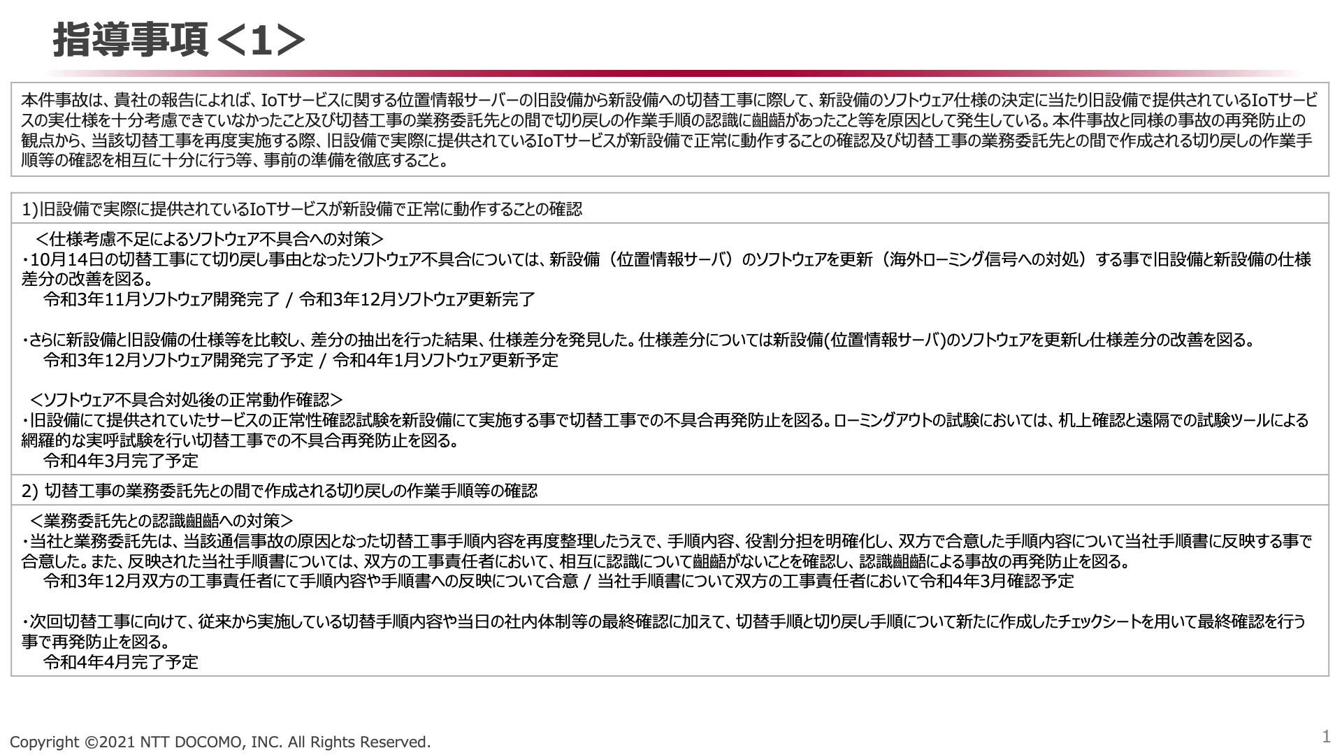 ・NTTドコモにて電気通信設備の切替工事を実施する際には旧設備と新設備との仕様差分を網羅的に確認するプロセスへ変更して不具合発生の防止を図る。プロセス変更は社内会議にて水平展開を実施する。