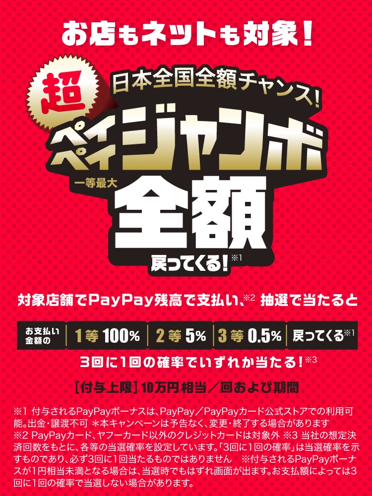 今回の超PayPay祭はPayPayでは「日本全国全額チャンス!超ペイペイジャンボ」や「超PayPay祭 対象加盟店で超おトクキャンペーン」をはじめとしてさまざまなお得なキャンペーンを実施する予定となっています。日本全国全額チャンス!超ペイペイジャンボでは期間中にオンライン加盟店含む対象店舗においてPayPayで対象の決済方法にて支払った際に抽選を実施します。